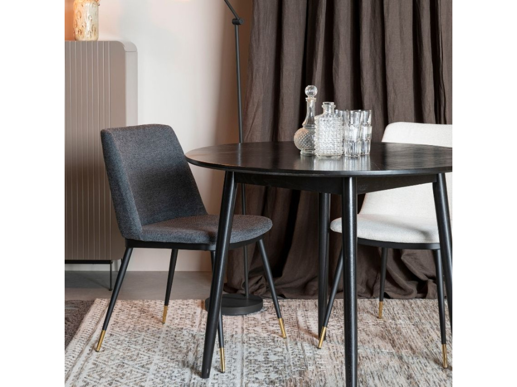 Stylová jídelní židle WLL LIONEL zaujme na první pohled svým minimalistickým designem. Příjemné látkové čalounění v tmavě šedé barvě a černě lakovaná kovová podnož se zlatými zakončeními vytváří společně atraktivní spojení, které do vašeho domova vnese nádech retro stylu. Židle se skvěle hodí do moderních i klasických interiérů.