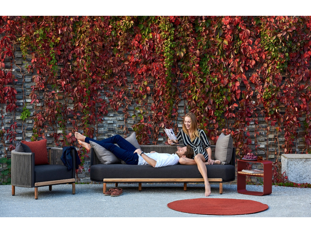 Klasická, ale moderní lounge kolekce Mindo 107 je založená na organicky tvarovaném hliníkovém rámu, výpletu z italského lana a teakového dřeva, které je z obnovitelných lesů. Celá kolekce nese, dle slov dánské designérky Rikke Frostové, heslo - navrženo pro snílky, kteří čekají v hotelovém resortu na splnění svých snů. Přesně taková je celá kolekce Mindo 107 - snová. Zrelaxujte na zahradní pohovce, v křesle či lenošce a užívejte si letní dny s plnou parádou. Pohovka je čalouněná kvalitní akrylovou látkou Sunbrella, která je odolná jak vůči vodě a nečistotám, tak vůči povětrnostním podmínkám a UV záření.