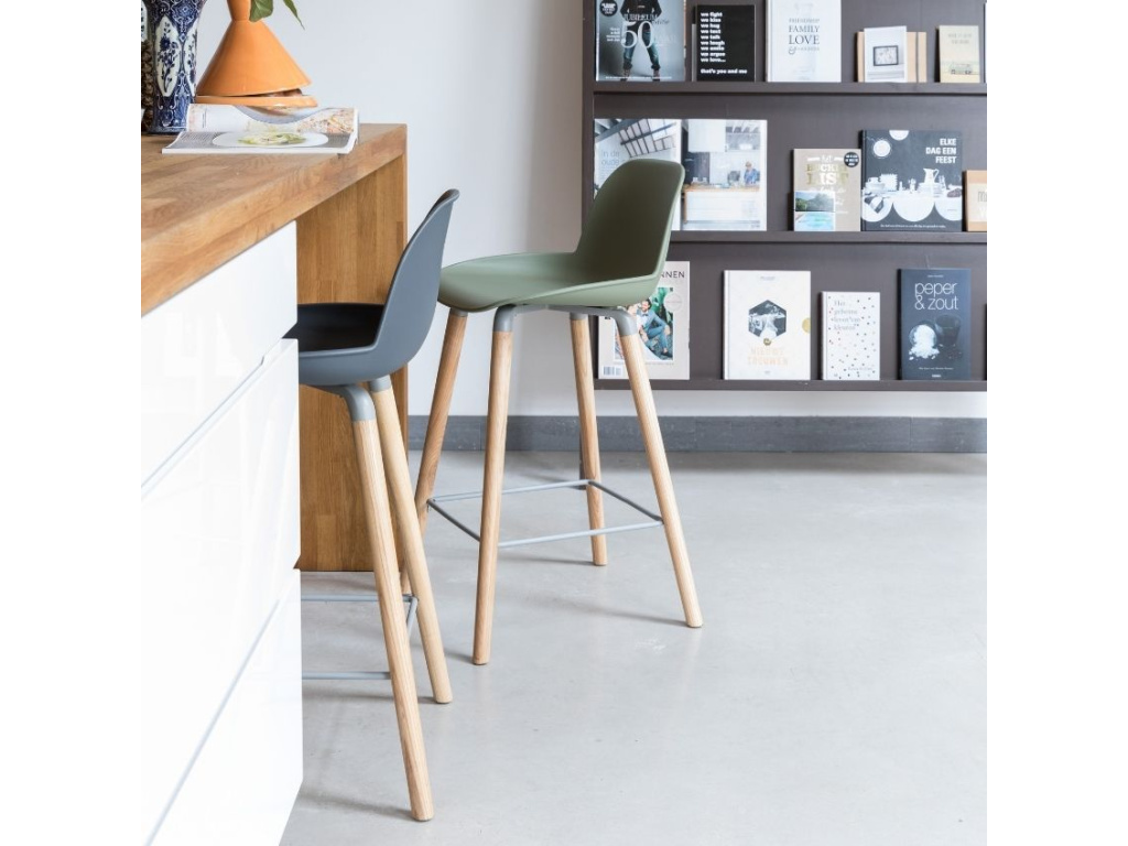 Tmavě šedá barová židle ZUIVER ALBERT KUIP perfektně vyladí moderně zařízené interiéry kuchyní i veřejných prostor barů či restaurací. Tvarovaný plastový sedák a nohy z masivního dřeva tvoří společně velmi svěží kombinaci v duchu moderních trendů skandinávského stylu. Pohodlí a moderní design - to jsou židle Albert Kuip.