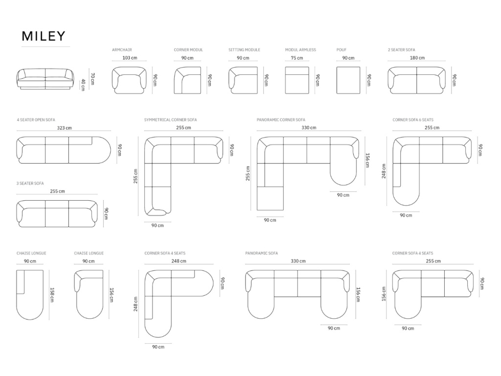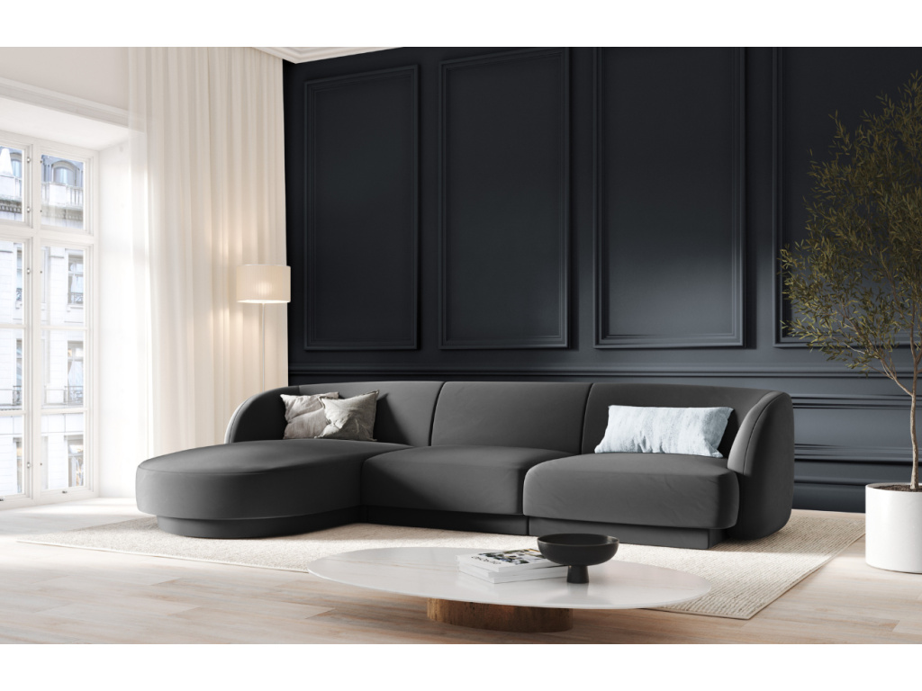 Čtyřmístnou rohovou pohovku Miley od značky Micadoni si zamilujete! Její obloukovitě tvarované opěradlo vybízí k tomu, abyste se na chvíli pohodlně usadili. Díky mírně zapuštěné základně dodává sezení vznášející se charakter, který dotváří vzhled připomínající oblak. Měkký, odolný a na pohled příjemný samet poskytuje nábytku lákavý vzhled, který vnese do místnosti záři a pocit sofistikovanosti. Pohovka je ideální volbou do interiéru v moderním nebo skandinávském stylu. K pohovce je možné přikoupit další produkty z kolekce Miley. Díky tomu si můžete vytvořit sedací soupravu, kterou je vhodné kombinovat se skleněným nebo dřevěným konferenčním stolkem.