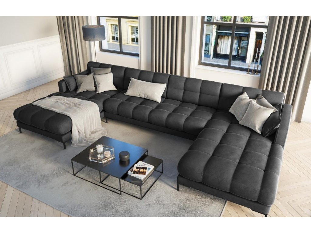 Elegantní šestimístná rohová pohovka MICADONI MAMAIA zaujme na první pohled svým nadýchaným vzhledem. Velmi příjemné sametové čalounění v tmavě šedé barvě a kovová podnož vytváří kontrast, který interiéru dodá elegantní vzhled a nádech luxusu. Díky zajímavému prošívání vzniká jemný design, který do vašeho domova vnese lehkost a styl. Opěrné polštářky zvednou úroveň vašeho odpočinku o stupeň výš. Díky praktickému tvaru do písmene U získáte rovnoměrně rozdělená místa k odpočinku. Nechte se obklopit komfortem ve společnosti produktů Mamaia.