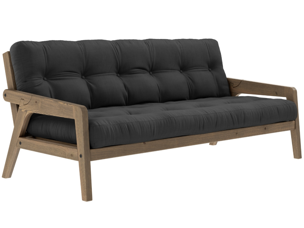 Třímístná rozkládací pohovka Grab značky Karup Design je dle slov designérů ideálním kouskem pro trávení společného času. Jednoduchým pohybem se elegantní pohovka promění na praktické lůžko. Konstrukce z masivního borovicového dřeva s FSC certifikací je doplněna kvalitní 14 cm vysokou futonovou matrací, která v sobě kombinuje recyklovaná vlákna a 4 cm pěnu. Praktickým detailem této pohovky jsou designové opěrky, které snadno odepnete a vytvoříte tak postel pro dva. Grab se skvěle hodí do skandinávsky laděných domovů. Představuje skvělé řešení především pro menší interiéry, kde oceníte další místo na spaní. Vybrat si ji můžete v další barvě konstrukce či v mnoha barvách matrací.
