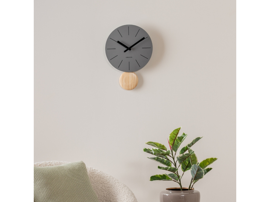 Nástěnné hodiny Lora v sobě kombinují nadčasový a minimalistický design. Velký šedý ciferník o průměru 30 cm kontrastuje s jednoduchými černými ručičkami. Dřevěné kyvadlo a jeho přírodní odstín příjemně doplňuje tmavý ciferník a dodává hodinám atypický prvek. Hodiny jsou k dostání ve více barevných variantách.