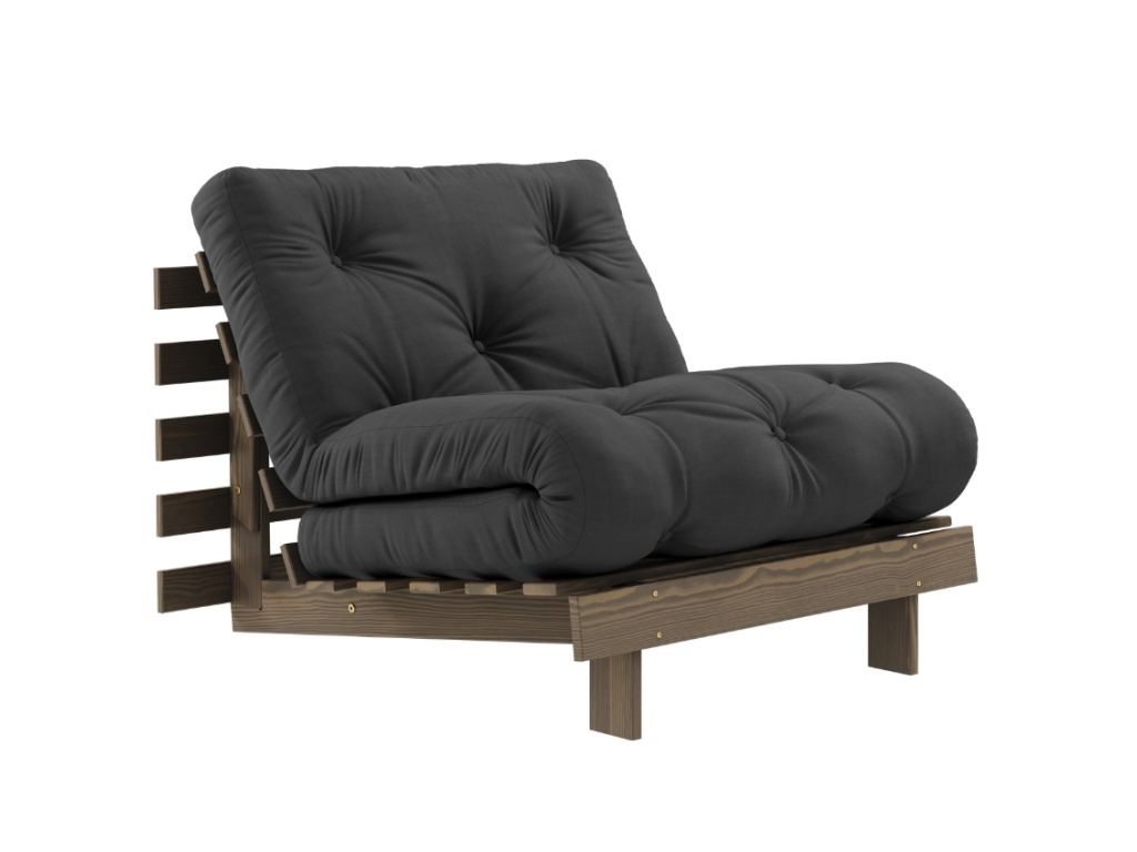Rozkládací křeslo Roots od značky Karup Design se rychle stane vaším oblíbeným společníkem při chvilkách odpočinku. Elegantní a stylové křeslo proměníte jednoduchým pohybem na praktické a pohodlné lůžko. Konstrukce z hnědého masivního borovicového dřeva s FSC certifikací je doplněna kvalitní 12 cm vysokou futonovou matrací, která v sobě kombinuje recyklovaná vlákna a 4 cm pěnu. Křeslo Roots skvěle doplní skandinávsky a minimalisticky laděné domovy. Ideální je například pro menší interiéry, kde oceníte další místo na spaní. Vybrat si ho můžete v široké škále barev.