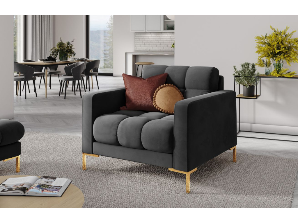 Chcete si krásně vybavit svůj domov? Křeslo Mamaia je pro to ideální volbou. Tento kus nábytku se vyznačuje jednoduchým, ale vkusným tvarem. Čalounění je vyrobeno z tkaniny imitující samet s jemným leskem, které je velmi měkké a hedvábné na dotek. Navíc se značí dobrou odolností proti oděru, díky tomu je vhodné i do komerčních prostor. Kromě estetických kvalit je křeslo také pozoruhodně pohodlné a ergonomické. Celek doplňují elegantní knoflíky na opěradle, které křeslu dodávají noblesu a stylové zakončení. Sezení je podtrženo kovovou, zlatě lakovanou podnoží. Mamaia je v nabídce v řadě barevném provedení. Vyberte si to pravé do vašeho interiéru!