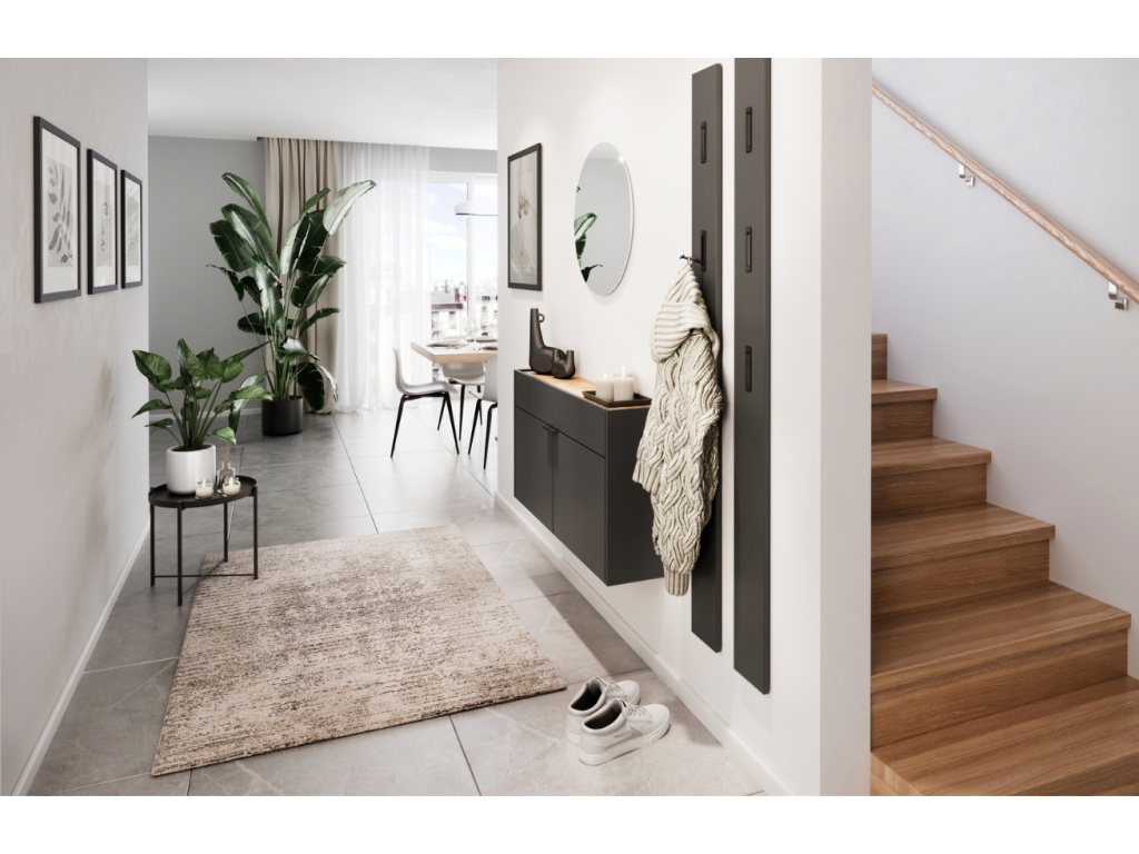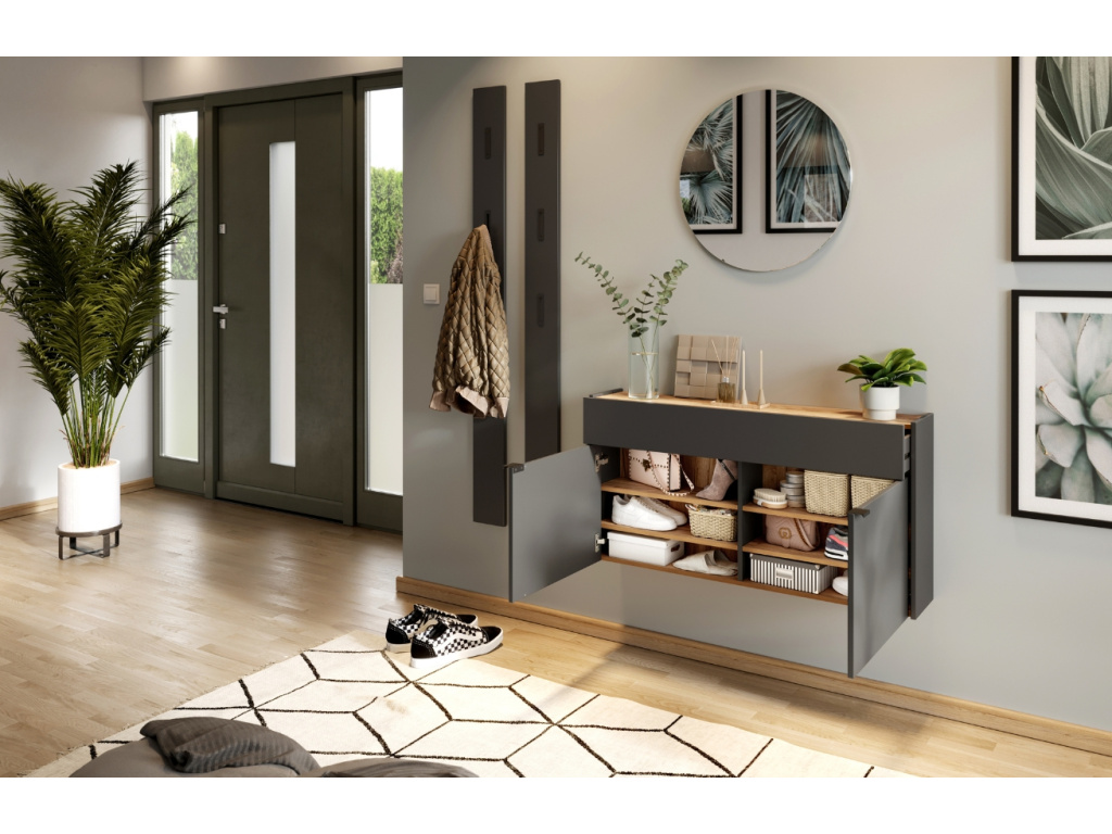 Stylový botník Ameca zaujme už na první pohled. Korpus z laminátu v tmavě šedé barvě přinese do vaší předsíně nebo chodby styl a nadčasovost. Minimalistický design botníku doplňuje horní deska v dekoru dubu a kovové úchytky. Do botníku se pohodlně vejde 12 párů bot. Botník se díky své velikosti hodí především do menších interiérů, kde se stane skutečným pomocníkem.