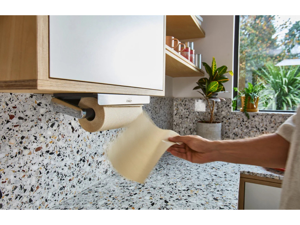 Hledáte elegantní způsob, jak mít papírové utěrky vždy po ruce, a přitom uvolnit pracovní plochu? Držák RollGrip od značky Joseph Joseph se diskrétně schová pod kuchyňskou skříňku a nabídne přesně to, co potřebujete – funkčnost, styl i chytré detaily. Jeho pružinové rameno zabrání samovolnému rozmotávání role a umožní pohodlné odtržení papíru jednou rukou. Elegantní povrch z kartáčované nerezové oceli skvěle zapadne do moderních i klasických kuchyní, a díky jednoduché instalaci a nastavitelným bočnicím ho snadno přizpůsobíte svému prostoru. RollGrip je ideální pomocník do malých prostor i velkých domácností – stylový, praktický a připravený zvládnout každodenní nepořádek s lehkostí.