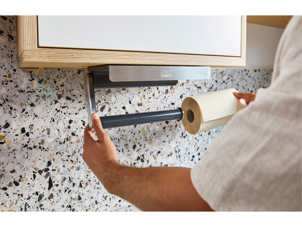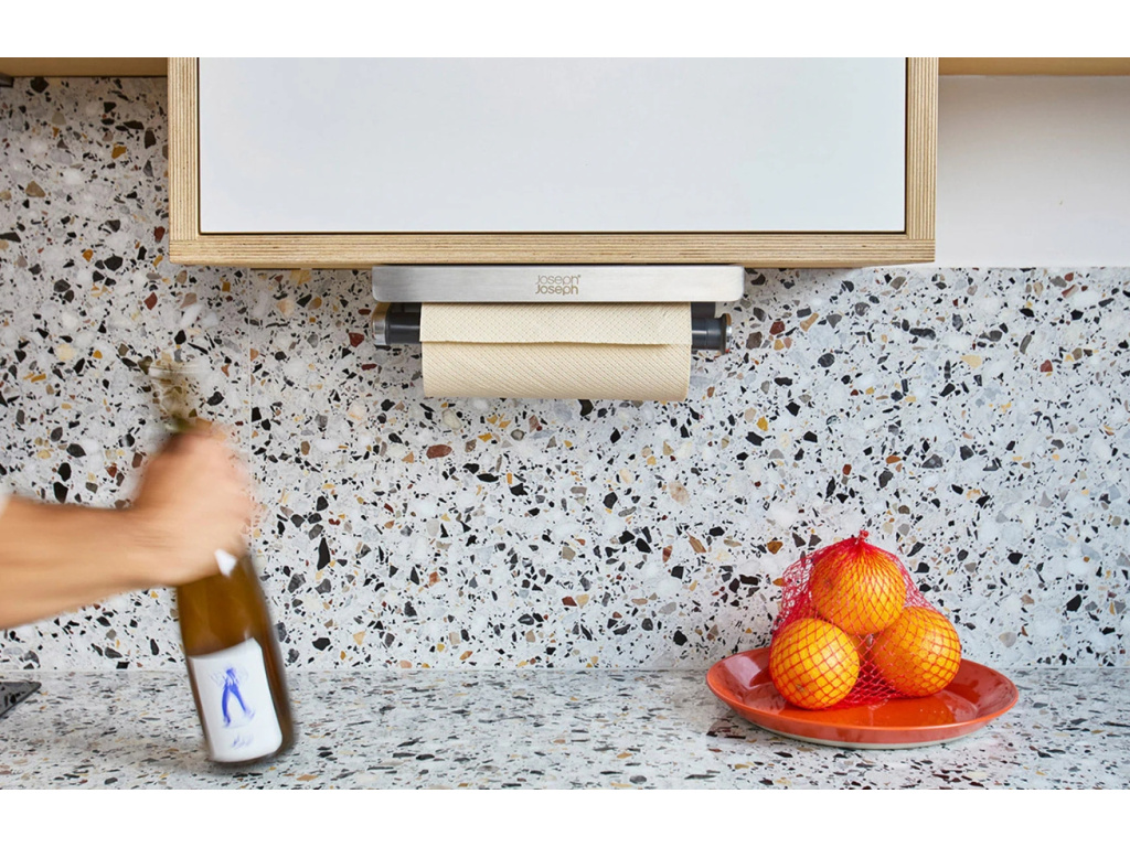 Hledáte elegantní způsob, jak mít papírové utěrky vždy po ruce, a přitom uvolnit pracovní plochu? Držák RollGrip od značky Joseph Joseph se diskrétně schová pod kuchyňskou skříňku a nabídne přesně to, co potřebujete – funkčnost, styl i chytré detaily. Jeho pružinové rameno zabrání samovolnému rozmotávání role a umožní pohodlné odtržení papíru jednou rukou. Elegantní povrch z kartáčované nerezové oceli skvěle zapadne do moderních i klasických kuchyní, a díky jednoduché instalaci a nastavitelným bočnicím ho snadno přizpůsobíte svému prostoru. RollGrip je ideální pomocník do malých prostor i velkých domácností – stylový, praktický a připravený zvládnout každodenní nepořádek s lehkostí.