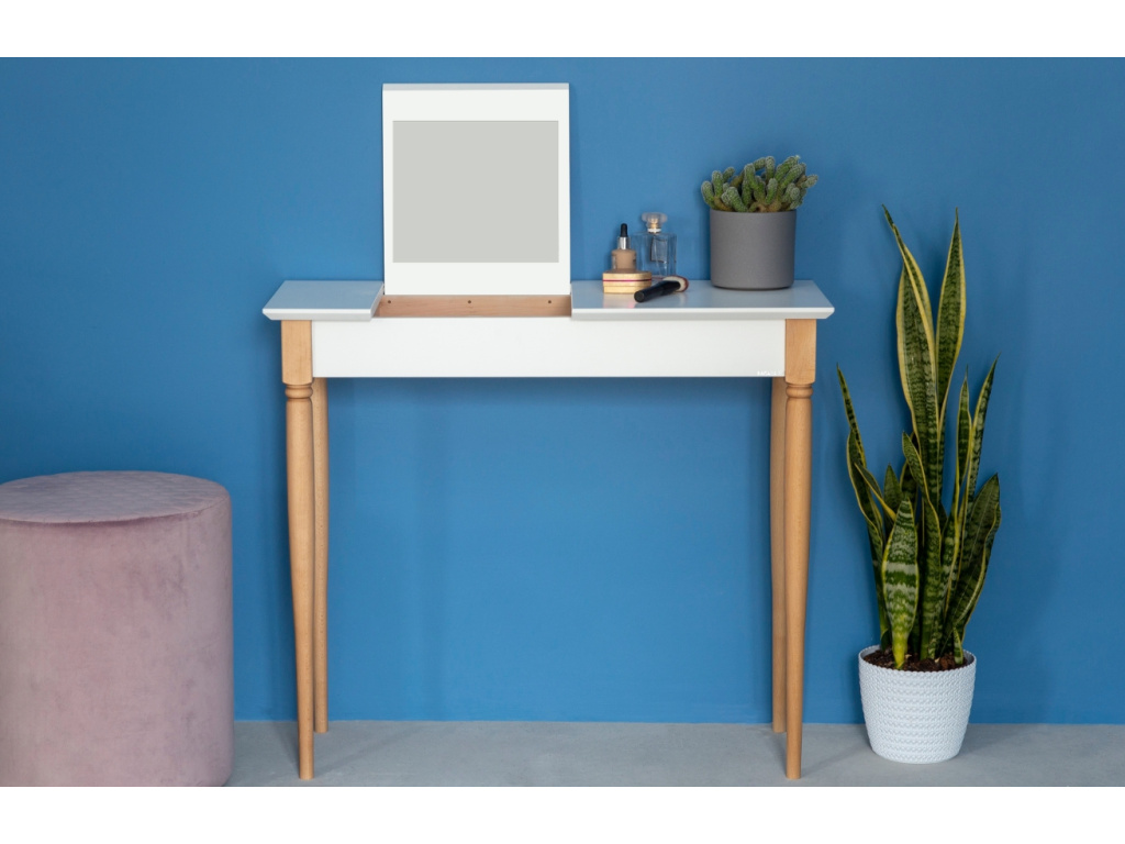 Toaletní stolek RAGABA MAMO je moderním stolkem, který je inspirovaný klasickým skandinávským designem. Stolek snoubí minimalismus v podobě čisté desky z MDF a laminátu spolu s elegancí ve formě podnože, vyrobené z bukového masivu. Praktickým prvkem na desce je výklopné zrcadlo, pod kterým se skrývá úložný prostor na různé šperky či kosmetiku. Díky své úsporné velikosti se toaletní stolek hodí i do menších interiérů a skvěle vynikne například v ložnici, obývacím pokoji či předsíni.