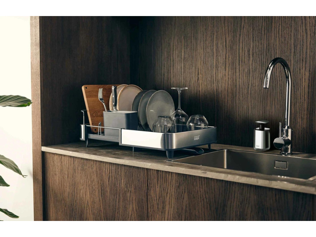 Praktický odkapávač a dávkovač mýdla Rethink Your Sink bude nepostradatelným pomocníkem při ručním mytí nádobí. Odkapávač je rozšiřovatelný a v případě potřeby umožňuje snadné zvětšení odkapávací plochy na téměř dvojnásobek původní velikosti. Disponuje také odtokovým uzávěrem s otočnou hubičkou, kterou nasměrujete do dřezu a vypustíte přebytečnou vodu. Ocelové držáky jsou zakončeny hroty s ochrannou proti poškrábání, proto jsou vhodné pro všechny druhy nádobí včetně sklenic. Nádoba na příbory je odnímatelná. Odkapávač má také protiskluzné nožky, zajišťující jeho stabilitu na pracovní desce. Chytrý design dávkovače na mýdlo umožňuje ovládat pumpičku mýdla zápěstím nebo předloktím, proto se dávkovače znečištěnými dlaněmi vůbec nemusíte dotýkat. Průhledná spodní část dávkovače vás upozorní na nutnost doplnit obsah nádobky a protiskluzná základna zajistí stabilitu při použití.