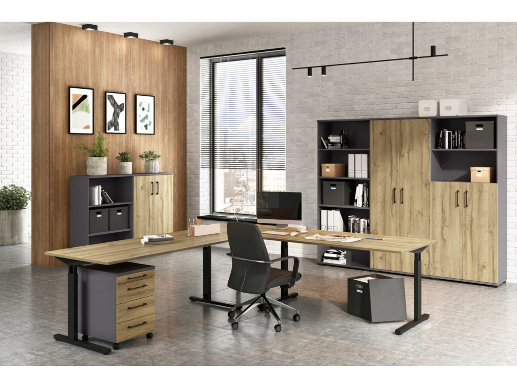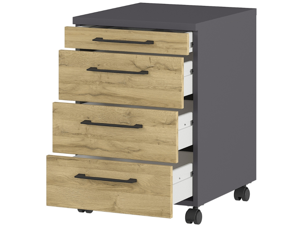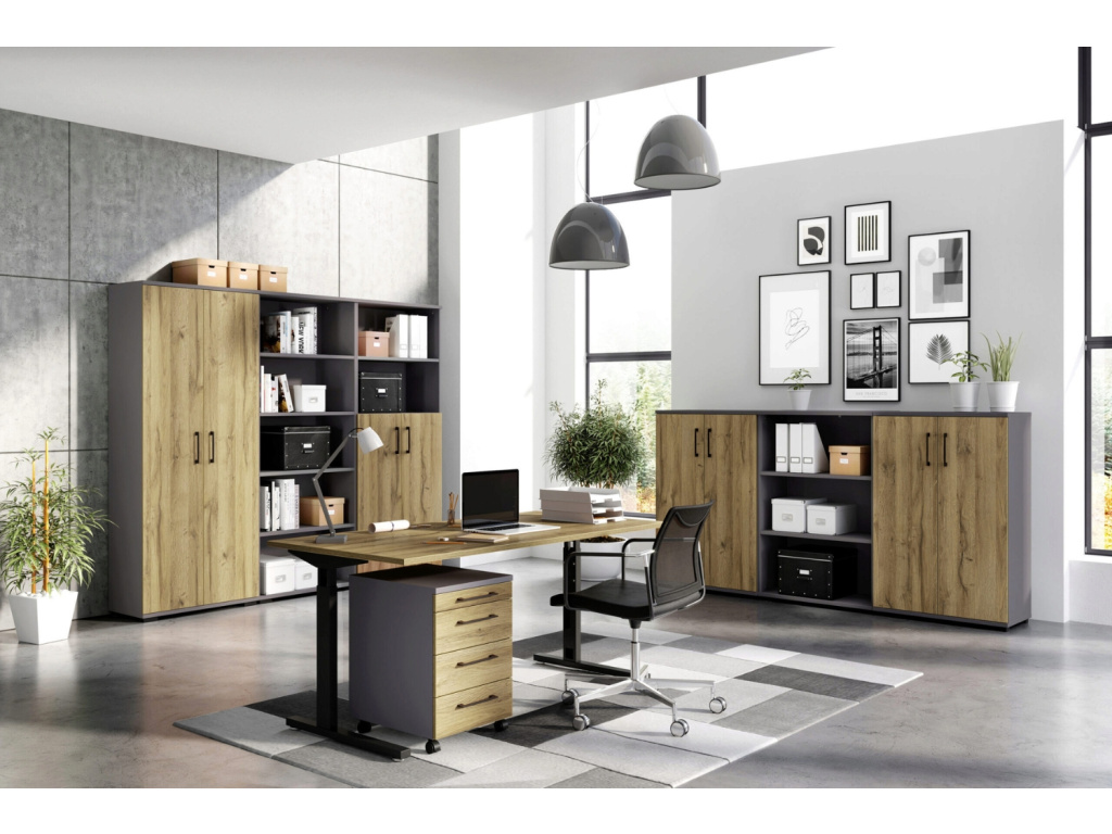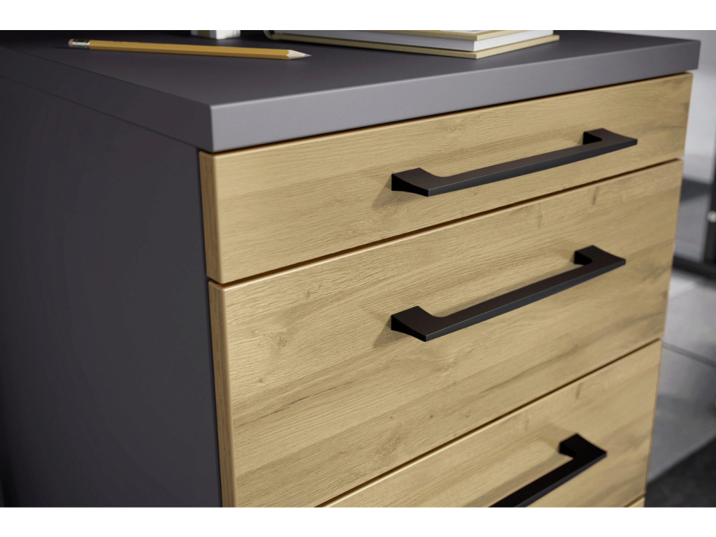 Pojízdný kontejner Profi 2.0 od značky Germania vnese do pracovního prostoru řád, styl i praktičnost v dokonale vyváženém poměru. Jeho tmavě šedé provedení v kombinaci s přírodním dubem Grandson působí svěže a elegantně, takže se skvěle hodí do moderní kanceláře i domácí pracovny. Za jeho kompaktním vzhledem se skrývá promyšlená funkčnost. Zásuvky nabízejí dostatek prostoru pro dokumenty, kancelářské potřeby i drobnosti, které chcete mít vždy po ruce. Povrch z odolné melaminové pryskyřice chrání kontejner před poškrábáním a vlhkostí, zatímco kvalitní ABS hrany zaručují dlouhou životnost a precizní vzhled i při každodenním používání. Profi 2.0 je víc než jen úložný prvek – je to stylový a spolehlivý společník, který kombinuje preciznost, dlouhou životnost a estetiku, jenž do pracovního prostředí přinese klid, přehled i špetku luxusu. Dostupný je v několika barvách, takže si snadno vyberete variantu, která bude dokonale ladit s atmosférou vaší kanceláře.