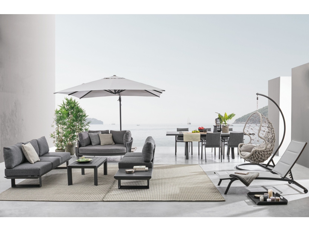 Zahradní set Bizzotto Konnor v tmavě šedém barevném provedení si oblíbíte pro jeho moderní a minimalistický design. Set se skládá z konferenčního stolku a dvou pohovek, dvoumístné a trojmístné. Pohovky mají bytelnou kovovou podnož i konstrukci a měkké sedáky s látkovým čalouněním. Potah sedáku je možné v případě potřeby sundat. Na designu pohovky oceníte šikovné vestavěné boční stolky pro odložení drobností nebo nápojů. Konferenční stolek je celý kovový a ve stejném odstínu jako pohovky a doplňuje celý set Konnor.