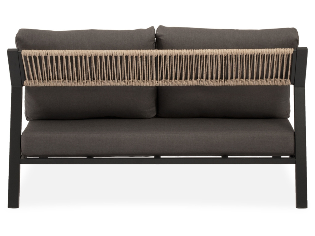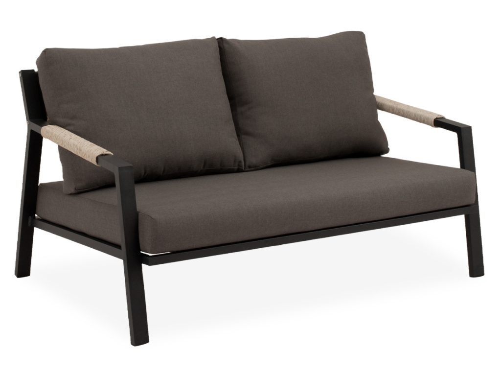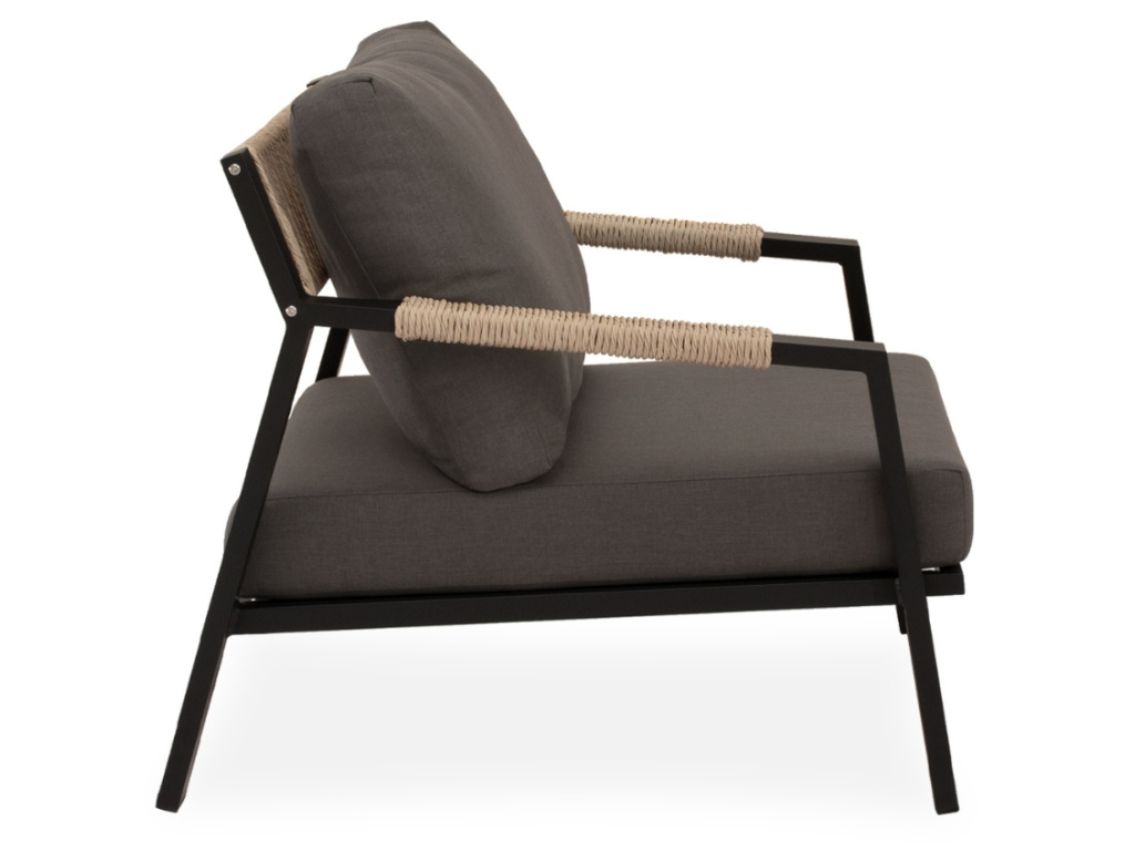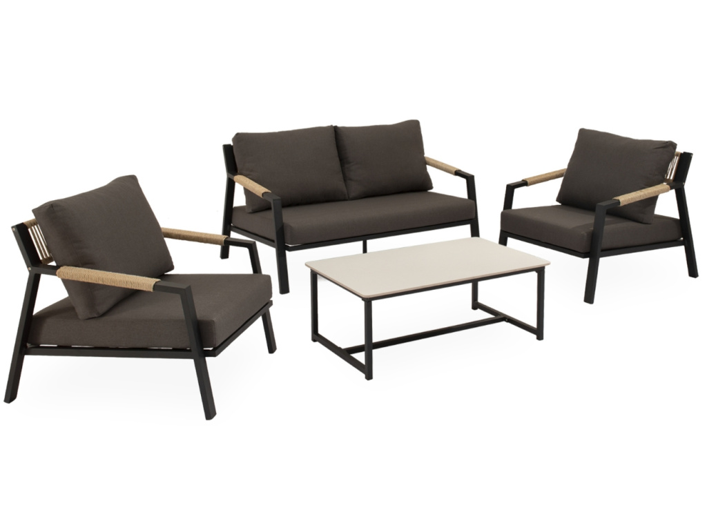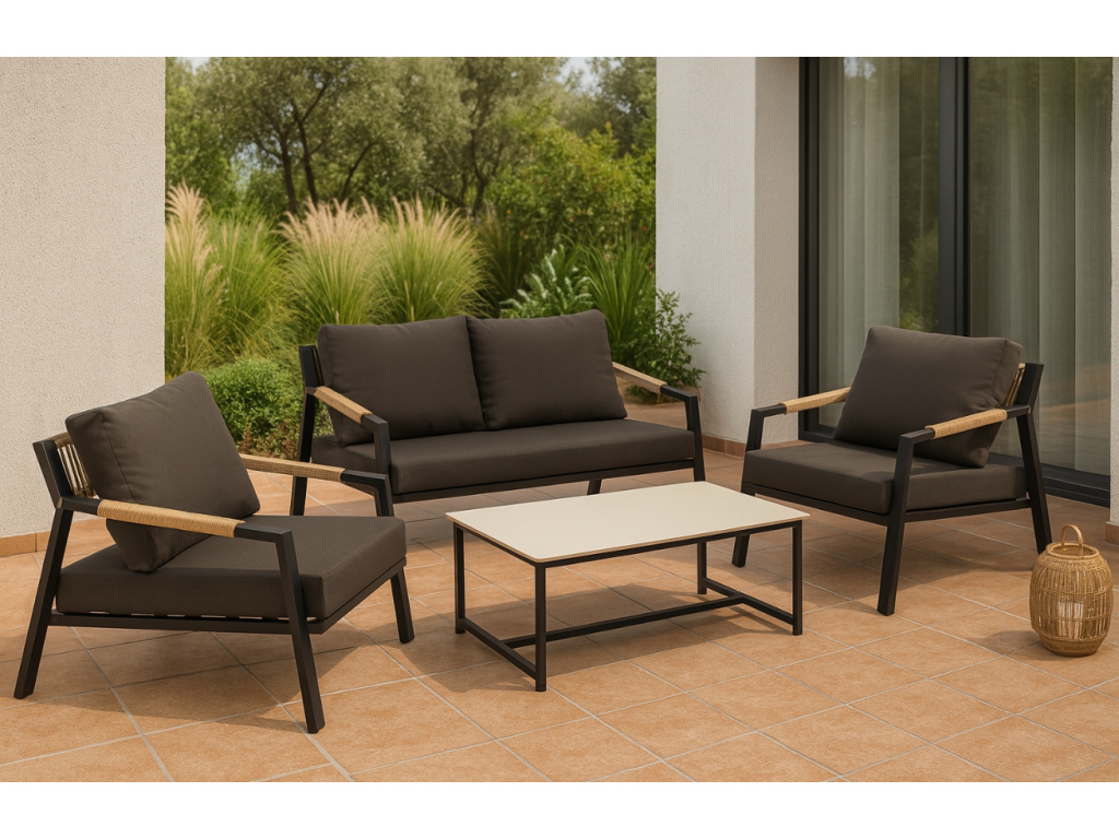 Zahradní set Muscat přináší do venkovního prostoru moderní vzhled s čistými liniemi a výrazným kontrastem. Sestava zahrnuje dvě prostorná křesla, dvoumístnou pohovku a konferenční stolek s bílou porcelánovou deskou, která působí elegantně a odlehčeně. Matně černá hliníková konstrukce je doplněna o detaily z výpletu v přírodním dekoru a pohodlné tmavě šedé polštáře, které podtrhují stylový minimalismus. Sestava Muscat je ideální volbou pro ty, kteří hledají funkční komfort s vytříbeným designem na terasu, balkon či zahradu.