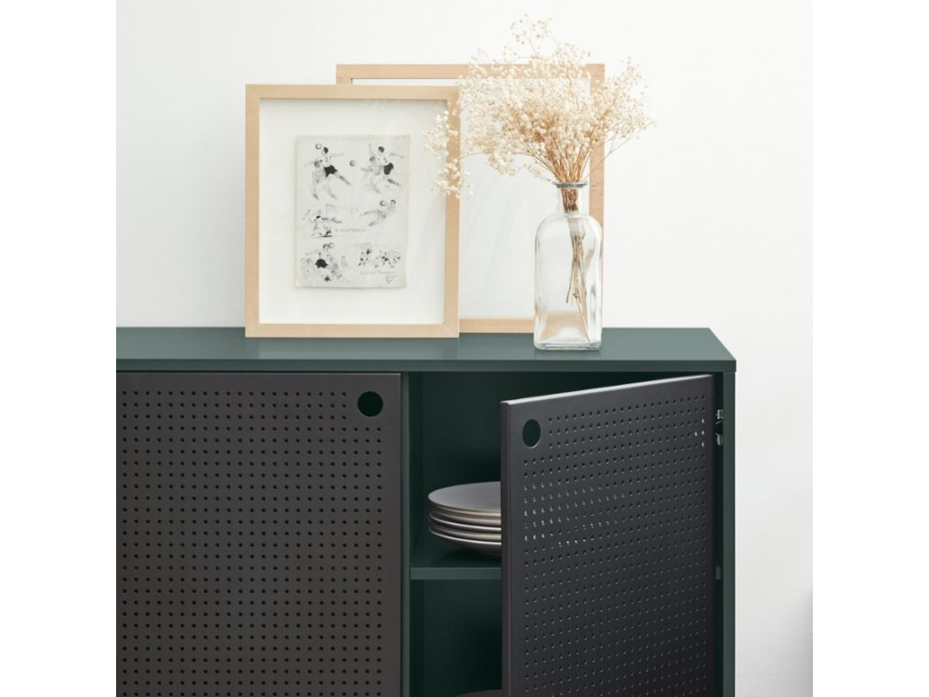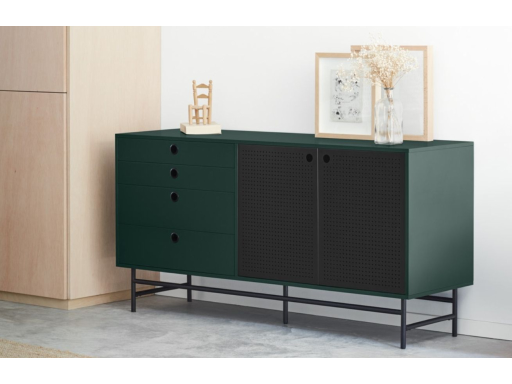 Tmavě zelená komoda Teulat Punto zaujme kombinací materiálů a designem s lehkým nádechem industriálního stylu, díky kterému komoda krásně vynikne v každém moderně zařízeném interiéru. Korpus komody je z MDF se zajímavým designovým prvkem v podobě děrovaných černých kovových dvířek a úchytů pro snadnější vysouvání zásuvek. Celek doplňuje tenká a elegantní kovová podnož v černé barvě. Úložný prostor je prakticky rozdělen do výsuvných zásuvek a polic za uzavíratelnými dvířky, což napomáhá k snadnější organizaci a rychlejšímu úklidu.