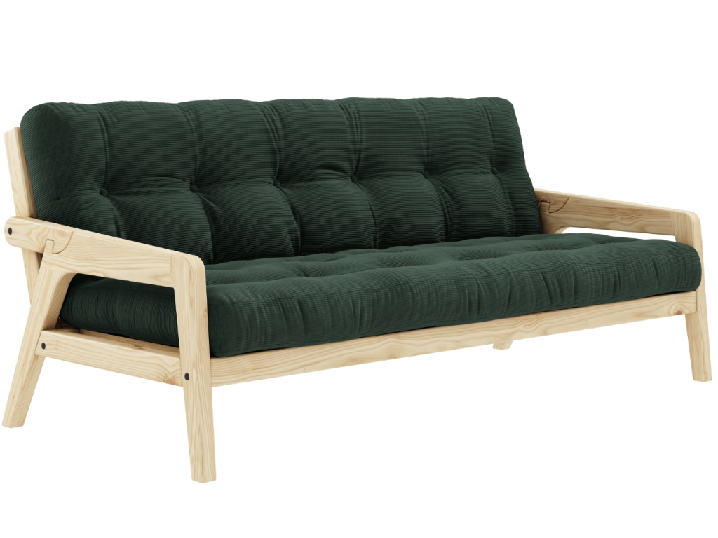 Třímístná rozkládací pohovka Grab značky Karup Design je dle slov designérů ideálním kouskem pro trávení společného času. Jednoduchým pohybem se elegantní pohovka promění na praktické lůžko. Konstrukce z masivního borovicového dřeva s FSC certifikací je doplněna kvalitní 14 cm vysokou futonovou matrací, která v sobě kombinuje recyklovaná vlákna a 4 cm pěnu. Praktickým detailem této pohovky jsou designové opěrky, které snadno odepnete a vytvoříte tak postel pro dva. Grab se skvěle hodí do skandinávsky laděných domovů. Představuje skvělé řešení především pro menší interiéry, kde oceníte další místo na spaní. Vybrat si ji můžete v další barvě konstrukce či v mnoha barvách matrací.