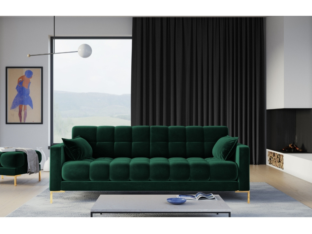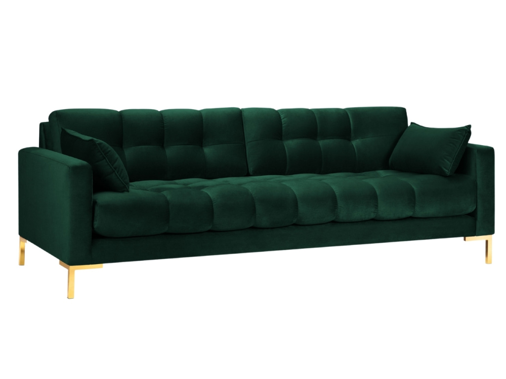 Elegantní čtyřmístná pohovka MICADONI MAMAIA zaujme na první pohled svým nadýchaným vzhledem. Velmi příjemné sametové čalounění a zlatá kovová podnož vytváří kontrast, který interiéru dodá elegantní vzhled a nádech luxusu. Díky zajímavému prošívání vzniká jemný design, který do vašeho domova vnese lehkost a styl. Opěrné polštářky zvednou úroveň vašeho odpočinku o stupeň výš. Nechte se obklopit komfortem ve společnosti pohovky Mamaia.
