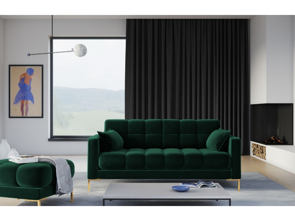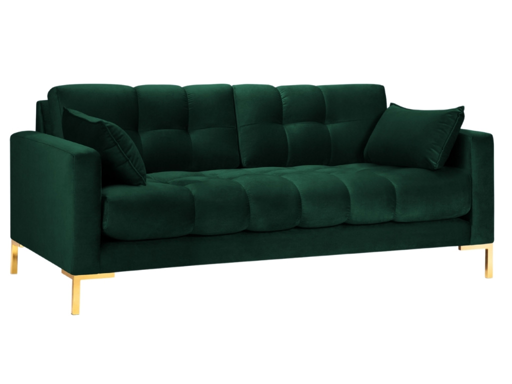 Elegantní dvoumístná pohovka MICADONI MAMAIA zaujme na první pohled svým nadýchaným vzhledem. Velmi příjemné sametové čalounění a zlatá kovová podnož vytváří kontrast, který interiéru dodá elegantní vzhled a nádech luxusu. Díky zajímavému prošívání vzniká jemný design, který do vašeho domova vnese lehkost a styl. Opěrné polštářky zvednou úroveň vašeho odpočinku o stupeň výš. Nechte se obklopit komfortem ve společnosti pohovky Mamaia.