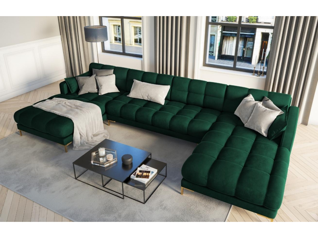 Elegantní šestimístná rohová pohovka MICADONI MAMAIA zaujme na první pohled svým nadýchaným vzhledem. Velmi příjemné sametové čalounění v tmavě zelené barvě a kovová podnož vytváří kontrast, který interiéru dodá elegantní vzhled a nádech luxusu. Díky zajímavému prošívání vzniká jemný design, který do vašeho domova vnese lehkost a styl. Opěrné polštářky zvednou úroveň vašeho odpočinku o stupeň výš. Díky praktickému tvaru do písmene U získáte rovnoměrně rozdělená místa k odpočinku. Nechte se obklopit komfortem ve společnosti produktů Mamaia.