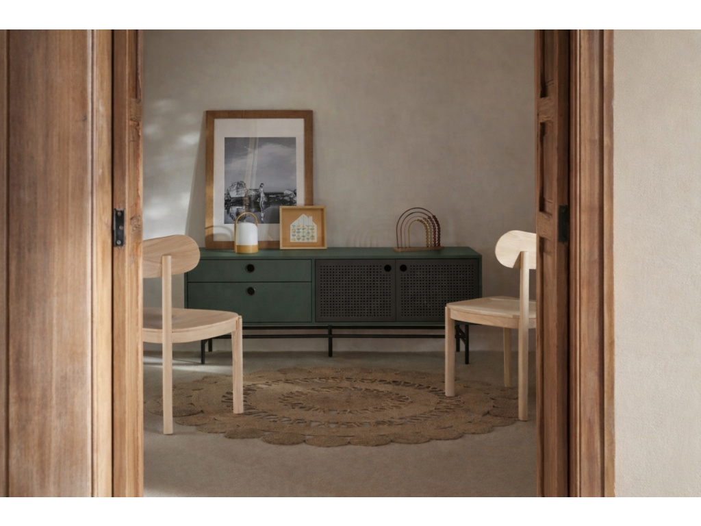 Tmavě zelený TV stolek Teulat Punto zaujme kombinací materiálů a designem s lehkým nádechem industriálního stylu, díky kterému krásně vynikne v každém moderně zařízeném interiéru. Korpus stolku je z MDF se zajímavým designovým prvkem v podobě perforovaných černých kovových dvířek a úchytů pro snadnější vysouvání zásuvek. Celek doplňuje tenká a elegantní kovová podnož v černé barvě. Úložný prostor je prakticky rozdělen do výsuvných zásuvek a polic za uzavíratelnými dvířky, což napomáhá k snadnější organizaci a rychlejšímu úklidu.