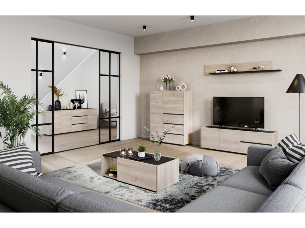 TV stolek Cantoria bude stylovou ozdobou každého moderního interiéru. Korpus z dřevotřísky v dekoru dubu je potažen melaminovou pryskyřicí, která stolku dodává jemný nádech a osobitý vzhled. Minimalistický design komody podtrhuje vrchní deska v černé barvě. Výhodou je možnost zvolit si ze dvou druhů podnože – v balení najdete vyšší i nižší provedení. Sami si tak vyberete, jaká bude vašemu interiéru více slušet. Úložný prostor je prakticky rozčleněn do dvou zásuvek a jedné police.