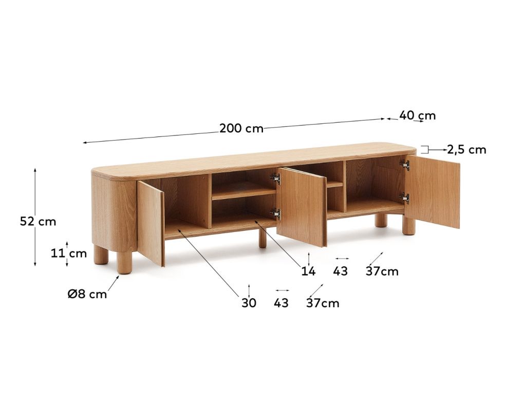 Úložné prostory ve vašem interiéru můžete vyřešit se sérií Kave Home Salaya! Najdete v ní komody, skříň, TV stolek i noční stolek – sladěná tak může být celá vaše domácnost. Elegantní zaoblené tvary společně s výraznou přírodní kresbou vybraný prostor zútulní a jen tak nevyjdou z módy. Ať už preferujete rustikální nebo scandi styl, do obou tyto designovky skvěle zapadnou. Prostorný TV stolek o šířce 200 cm nabídne úložný prostor v podobě 6 polic, které jsou uschovány za čtveřicí dvířek se soft-close zavíráním. Uschovejte do něj videokazety, DVD, knihy nebo alba s fotografiemi – zkrátka cokoliv, co vás napadne.
