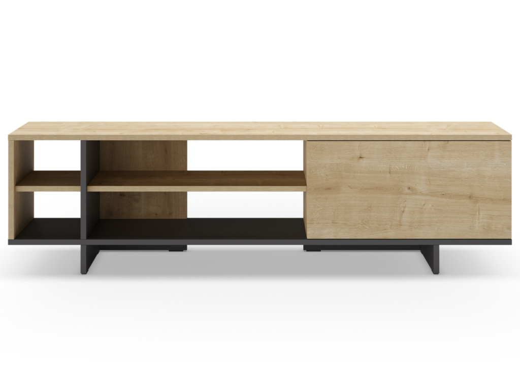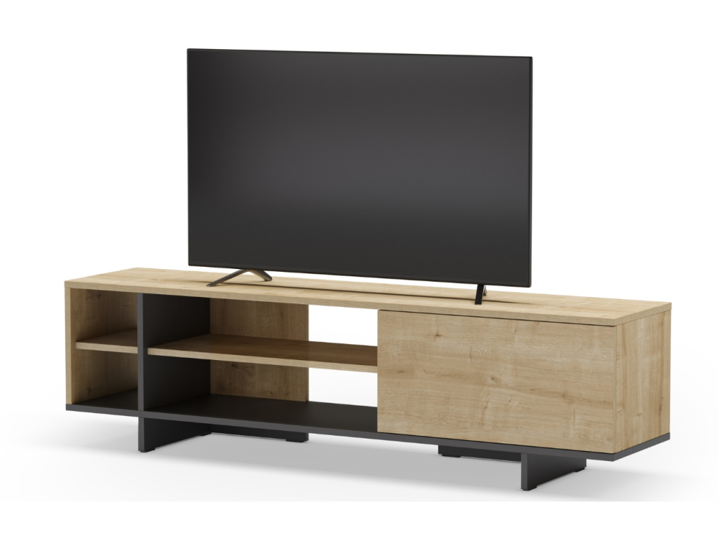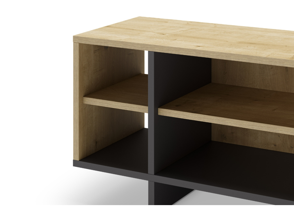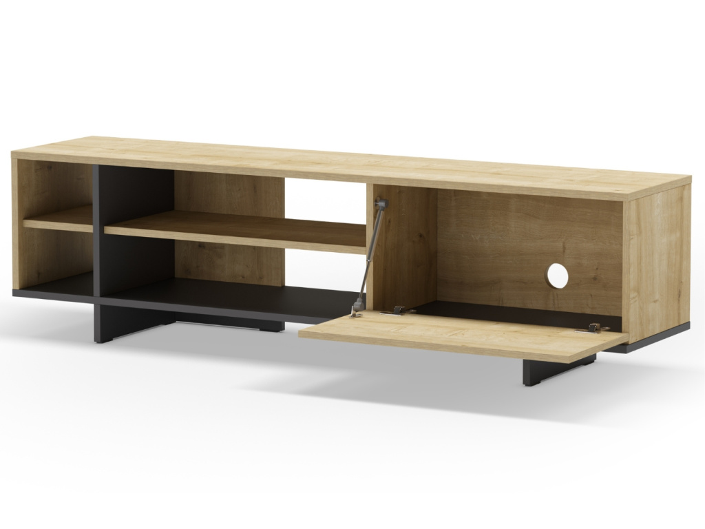 TV stolek Cequoia v kombinaci dubového dekoru a černého laminátu zaujme čistými liniemi a vzdušným dojmem. Otevřené police nabízejí praktický prostor pro elektroniku i dekorace, zatímco výklopná skříňka se skrytým otvorem na kabely zajistí elegantní řešení bez rušivých detailů. Díky stabilní konstrukci a odolným materiálům vydrží každodenní používání. K dispozici je ve dvou rozměrech a dvou barevných variantách.