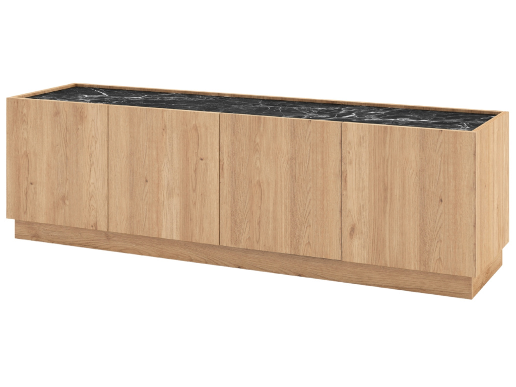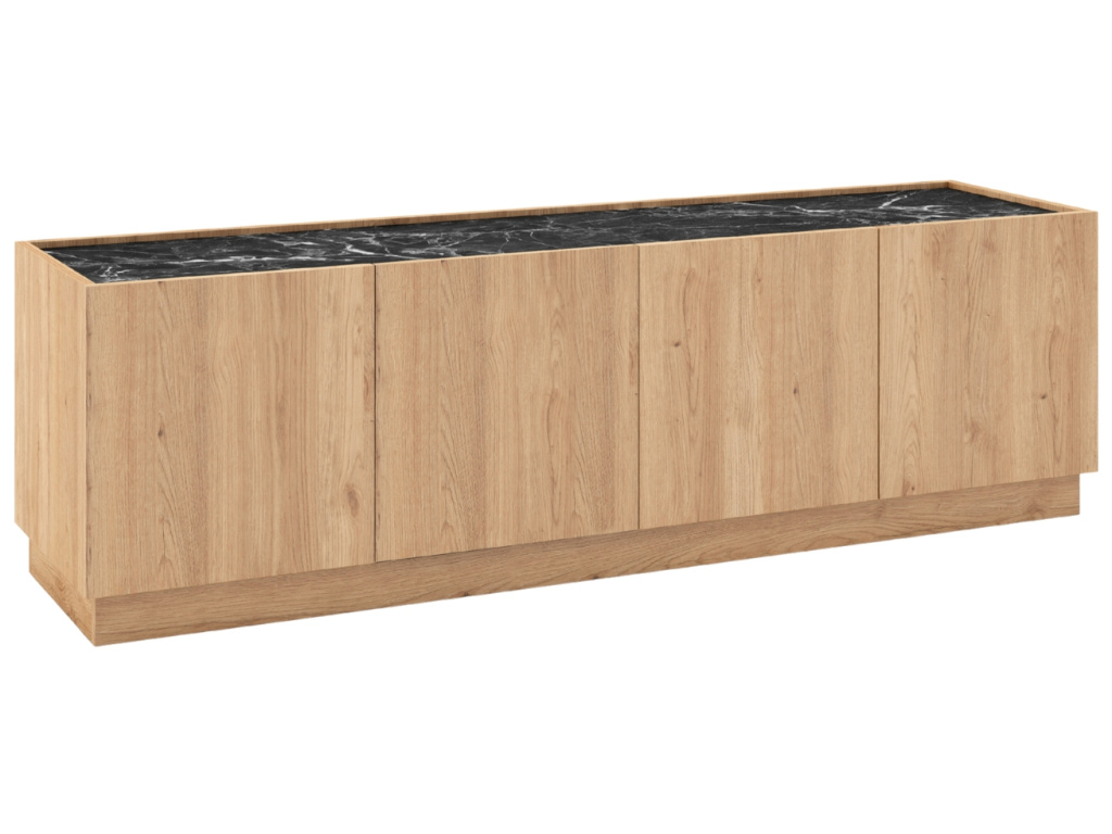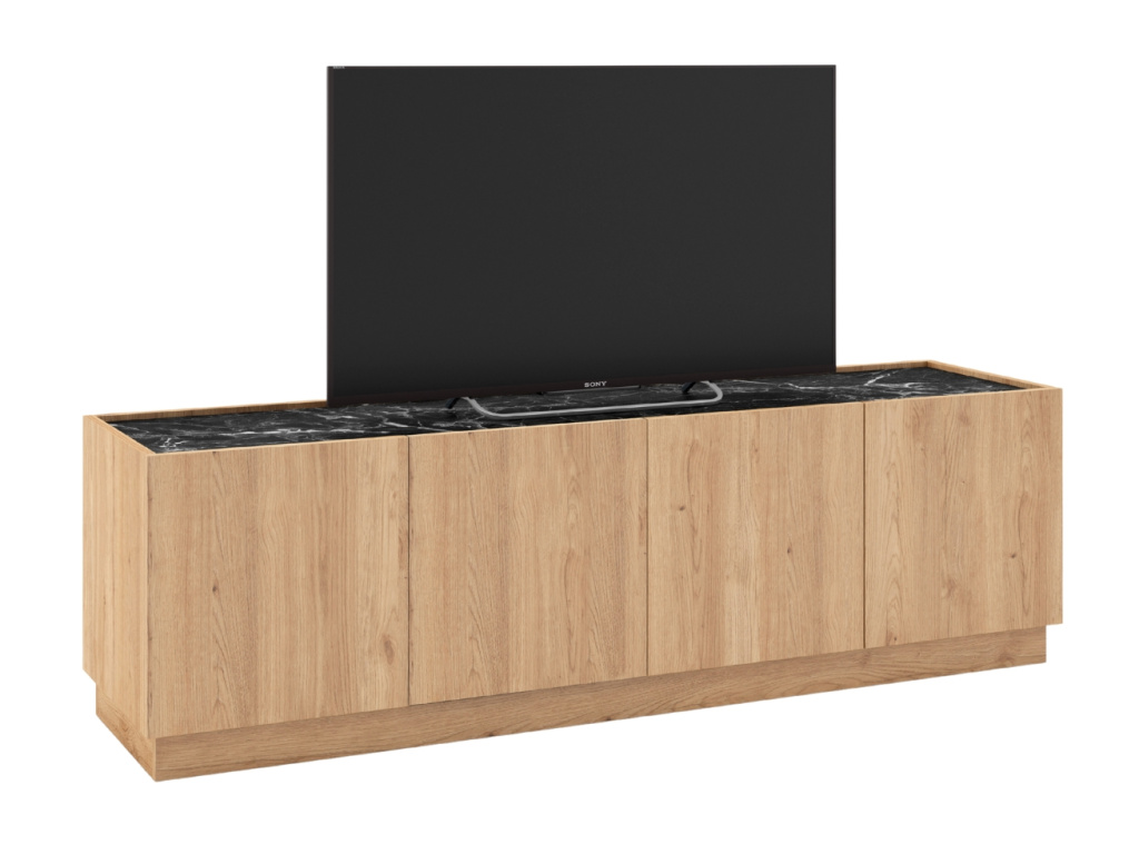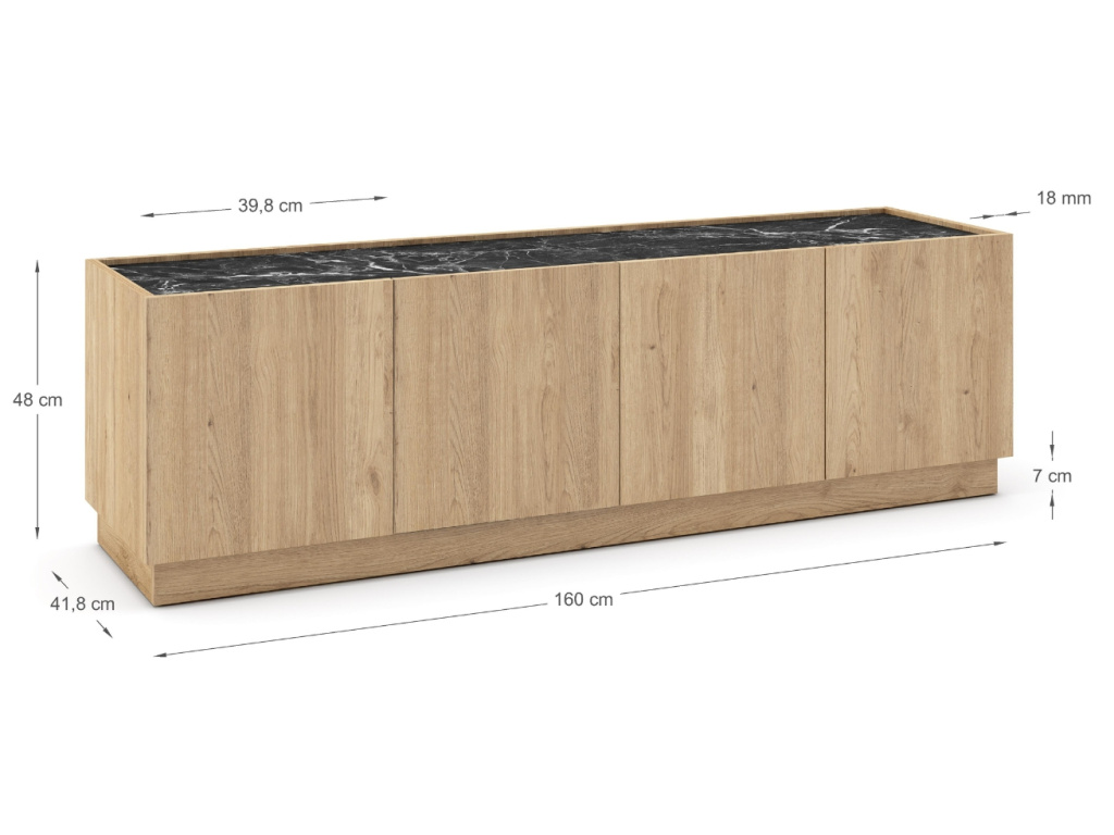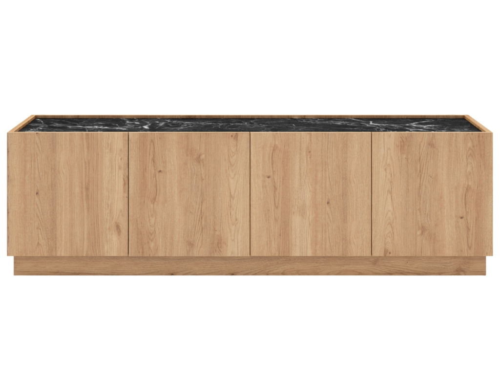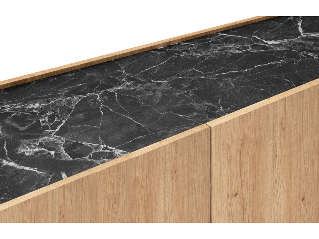 TV stolek Dione je vyroben z kvalitního laminátu a zaujme kontrastem dubového dekoru a výrazné horní desky s efektem černého mramoru. Tento stylový prvek dodává stolku elegantní výraz a dělá z něj poutavý doplněk moderního interiéru. Uvnitř nabízí dostatek uzavřeného úložného prostoru pro elektroniku i drobnosti. Součástí kolekce Dione jsou také čtyři komody v různých velikostech, které společně vytvoří funkční a sladěný celek v obývacím pokoji.