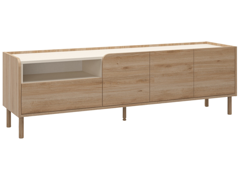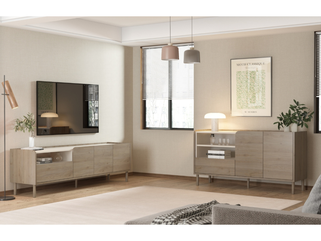 TV stolek z kolekce Monza značky Marckeric v sobě spojuje čistý severský design s praktickým řešením úložného prostoru. Kombinace MDF desek v šedohnědém laku a dekoru dubu působí přirozeně a moderně zároveň, zatímco zaoblené rohy a štíhlá podnož dodávají nábytku lehkost. Nabízí členitý prostor s otevřenými policemi, prostornou zásuvkou i uzavřenými skříňkami – ideální pro přehledné uložení všeho, co chcete mít po ruce i skryté. V kolekci Monza najdete tři varianty komod a TV stolek.