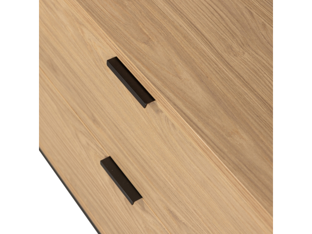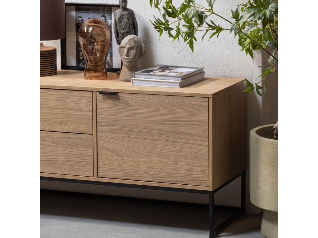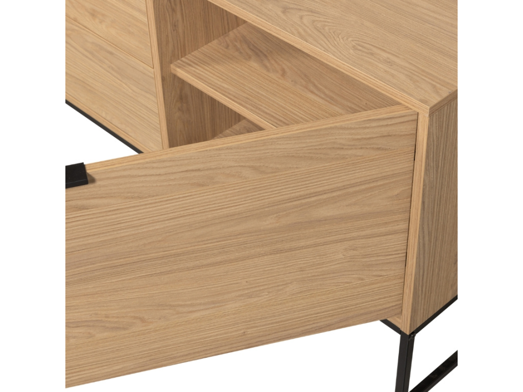 TV stolek Sinai nabízí praktický úložný prostor v podobě dvou širokých zásuvek a dvou uzavřených polic s dvířky. Deska z melaminu v přírodním dekoru dubu je doplněna o černě lakovanou kovovou podnož a vytváří tak moderní kontrast. Využít ho můžete i jako úložnou skříňku v pracovně nebo v ložnici, kde na horní desku naaranžujete zarámované obrazy nebo pokojové rostliny, a tím tak opticky vyplníte prázdný prostor v horní části. TV stolek skvěle doplní další produkty ze stejné série Sinai.