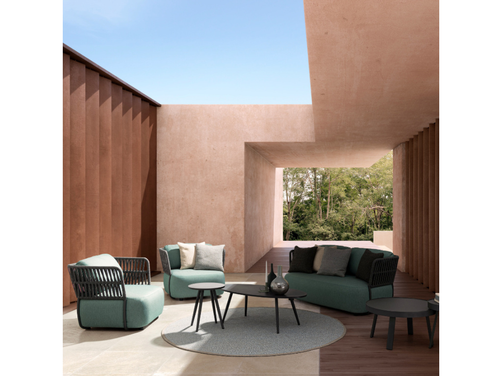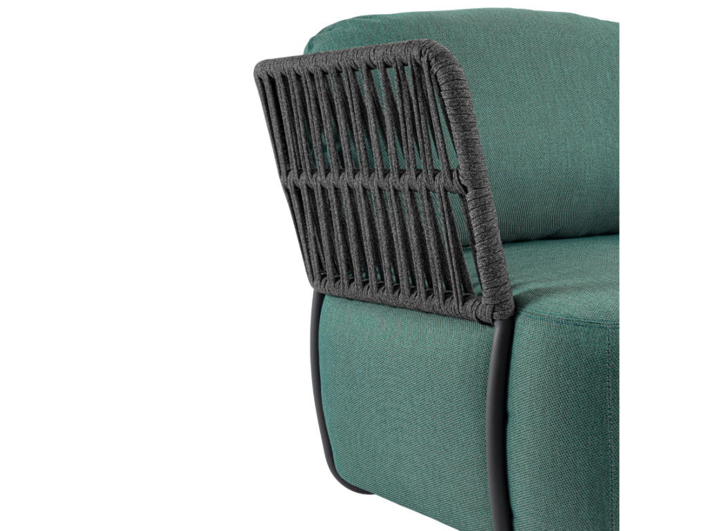 Křeslo Bizzotto Palmer má netradiční moderní vzhled. Konstrukce je tvořena z lakovaného hliníku, přičemž područky jsou vypletené tmavou olefinovou tkaninou. Sedák i zádový polštář jsou potažené taktéž olefinovou látkou v odstínu tyrkysové, která je velmi odolná proti UV záření i vodě. Řada Palmer nabízí také pohovky, které mohou vytvořit společně s křesly krásný set do vaší zahrady. Toto tyrkysové křeslo Palmer oceníte pro vysoký komfort při dlouhodobém sezení na terase.