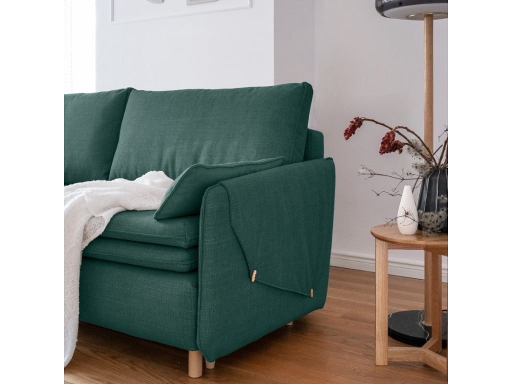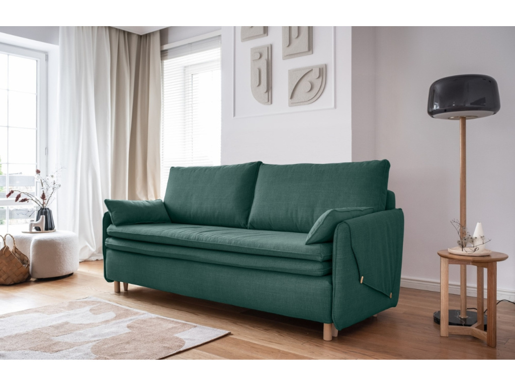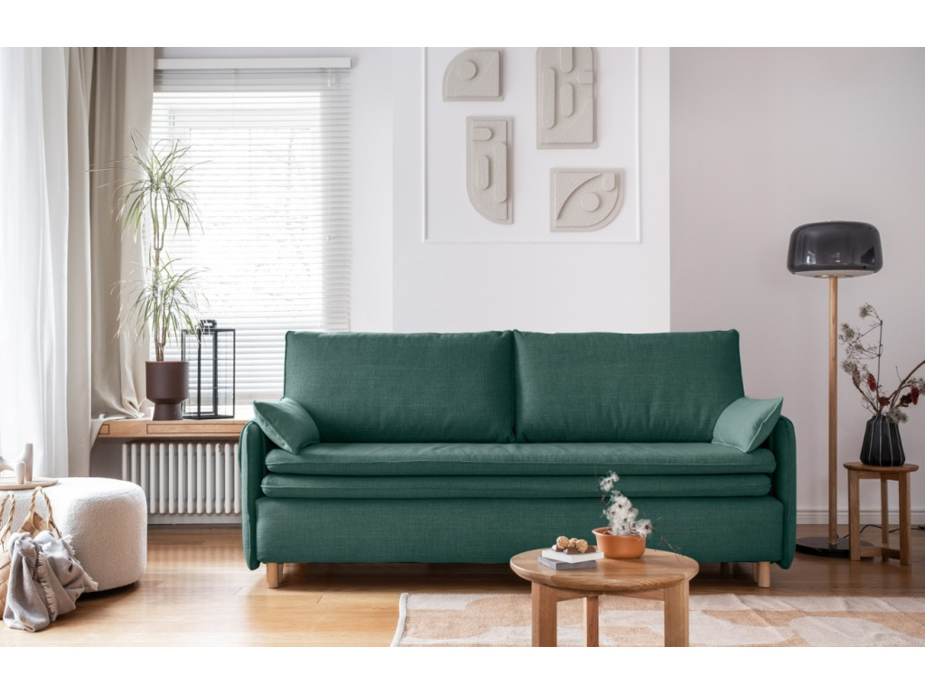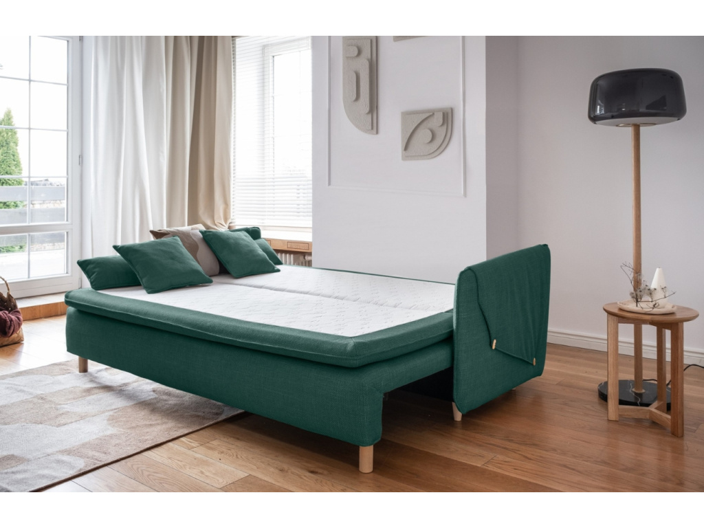 Rozkládací pohovka Simon od značky Miuform představuje ideální řešení do méně prostorných bytů. Pohovka je čalouněna příjemnou látkou, kterou po stranách zdobí dřevěné knoflíky. Zajímavostí této pohovky jsou úzké područky a vyšší dřevěná podnož, díky kterým působí lehkým a vzdušným dojmem. Pohodlný sedák snadno rozložíte na dvě matrace a rázem tak získáte místo na spaní o rozloze 140 x 190 cm. Pohovka nabízí také praktický úložný prostor, kam se pohodlně vejdou polštářky a deky.