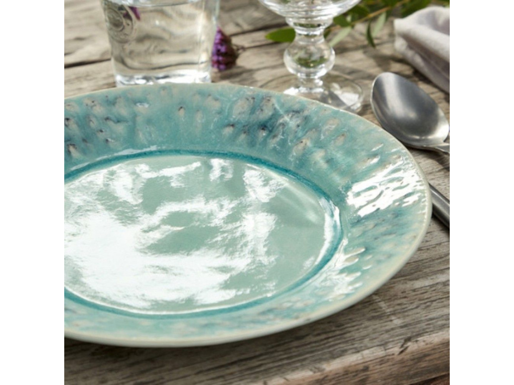 Kameninový talíř od značky COSTA NOVA ze série MADEIRA. Lesklá tyrkysová glazura s popraskaným efektem vytváří starožitný dojem, malé černé detaily na lemu dodávají nádech ruční výroby. Akvamarínový odstín barvy skvěle ladí s námořnickým či středomořským interiérem, v němž dominují přírodní prvky. Talíř lze díky své velikosti používat také jako servírovací tác.