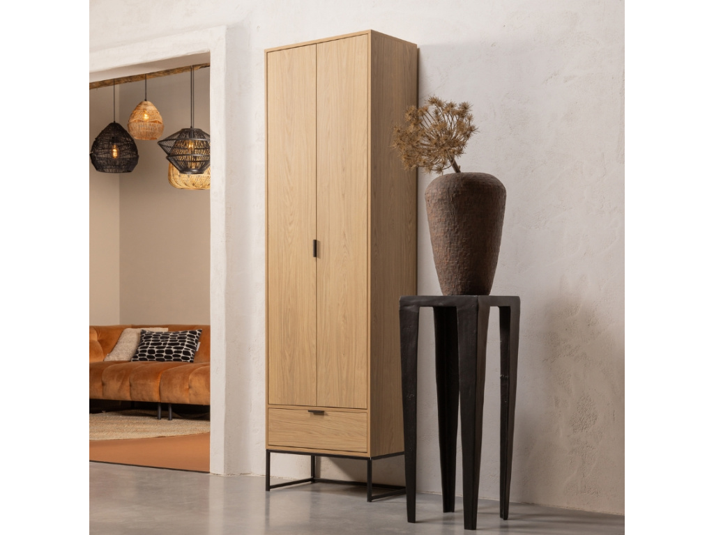 Úzká skříň Sinai nabízí praktický úložný prostor v podobě čtyř uzavřených polic s dvířky a jedné zásuvky. Deska z melaminu v přírodním dekoru dubu je doplněna o černě lakovanou kovovou podnož a vytváří tak moderní kontrast. Jedná se o minimalistickou a praktickou skříň, která se dobře kombinuje s dalším nábytkem a díky své úzké šířce se vejde i do malých prostor jako je třeba předsíň. Zapadne do moderních i klasicky zařízených interiérů a skvěle ji doplní další produkty ze stejné série Sinai.