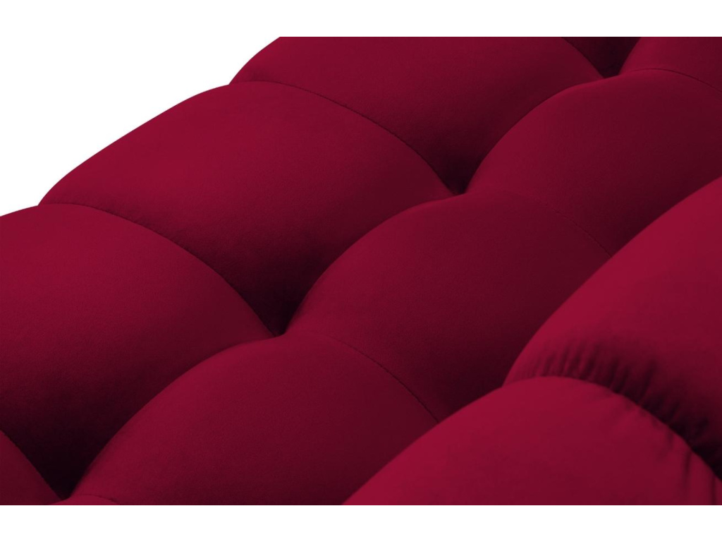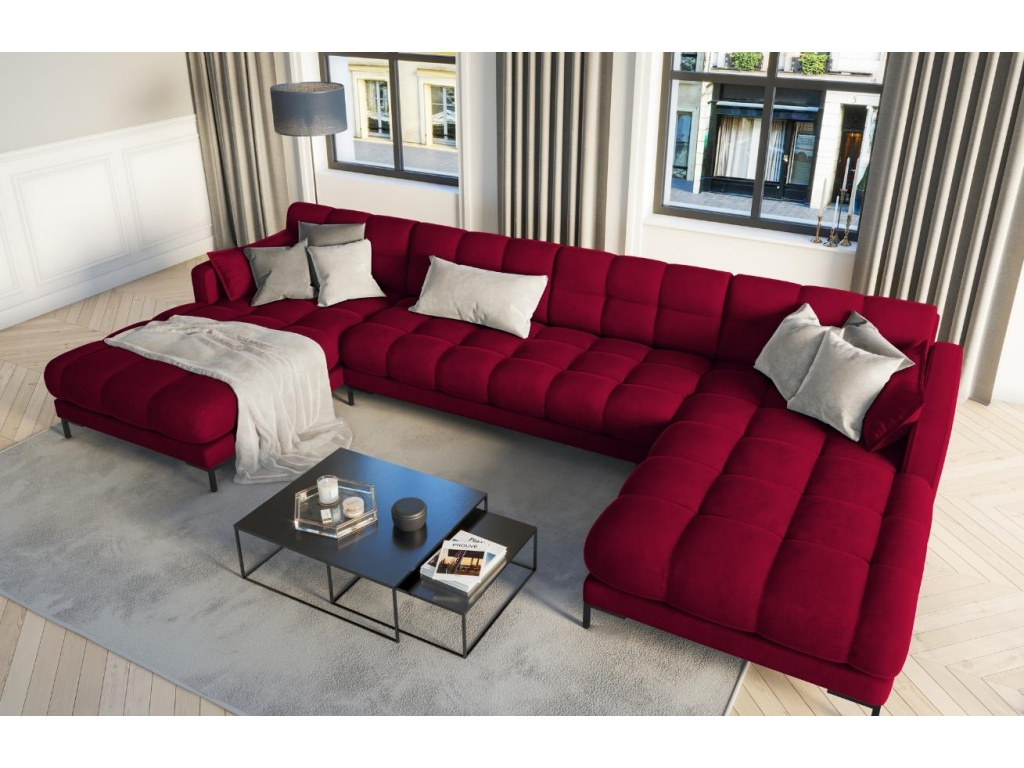 Elegantní šestimístná rohová pohovka MICADONI MAMAIA zaujme na první pohled svým nadýchaným vzhledem. Velmi příjemné sametové čalounění v červené barvě a kovová podnož vytváří kontrast, který interiéru dodá elegantní vzhled a nádech luxusu. Díky zajímavému prošívání vzniká jemný design, který do vašeho domova vnese lehkost a styl. Opěrné polštářky zvednou úroveň vašeho odpočinku o stupeň výš. Díky praktickému tvaru do písmene U získáte rovnoměrně rozdělená místa k odpočinku. Nechte se obklopit komfortem ve společnosti produktů Mamaia.