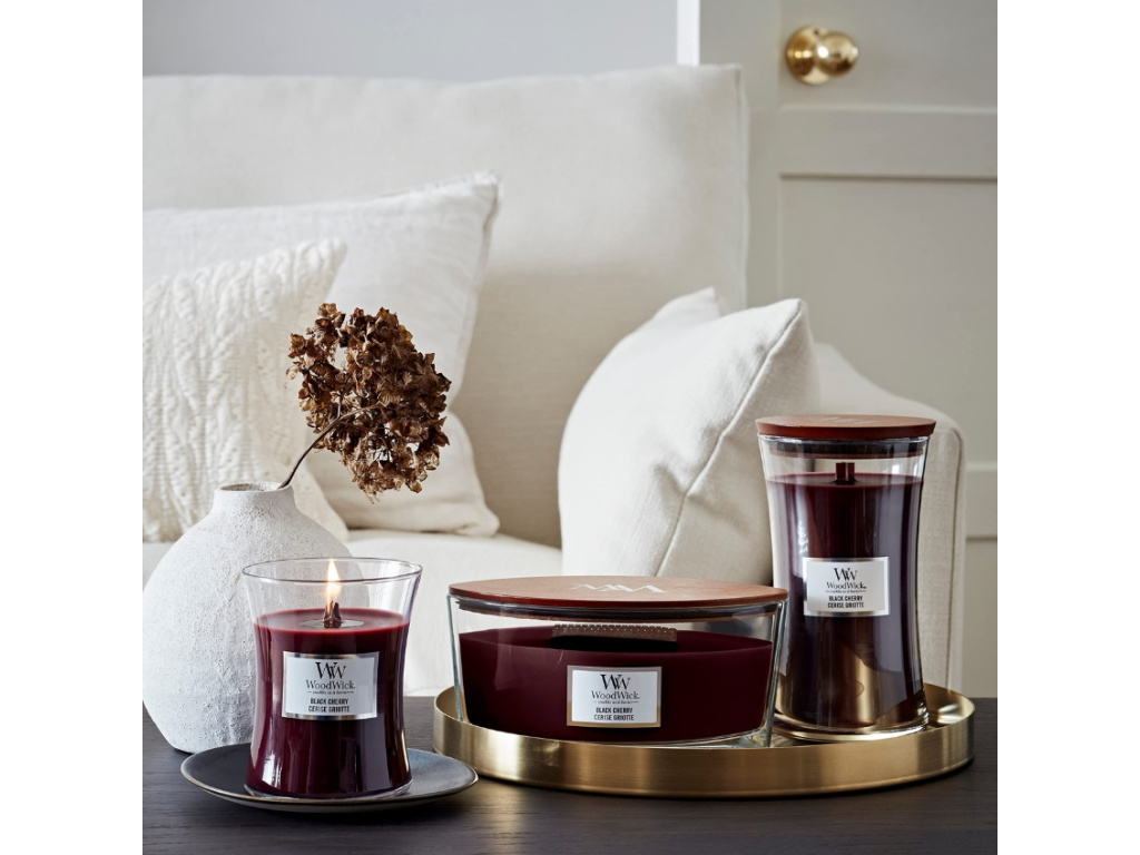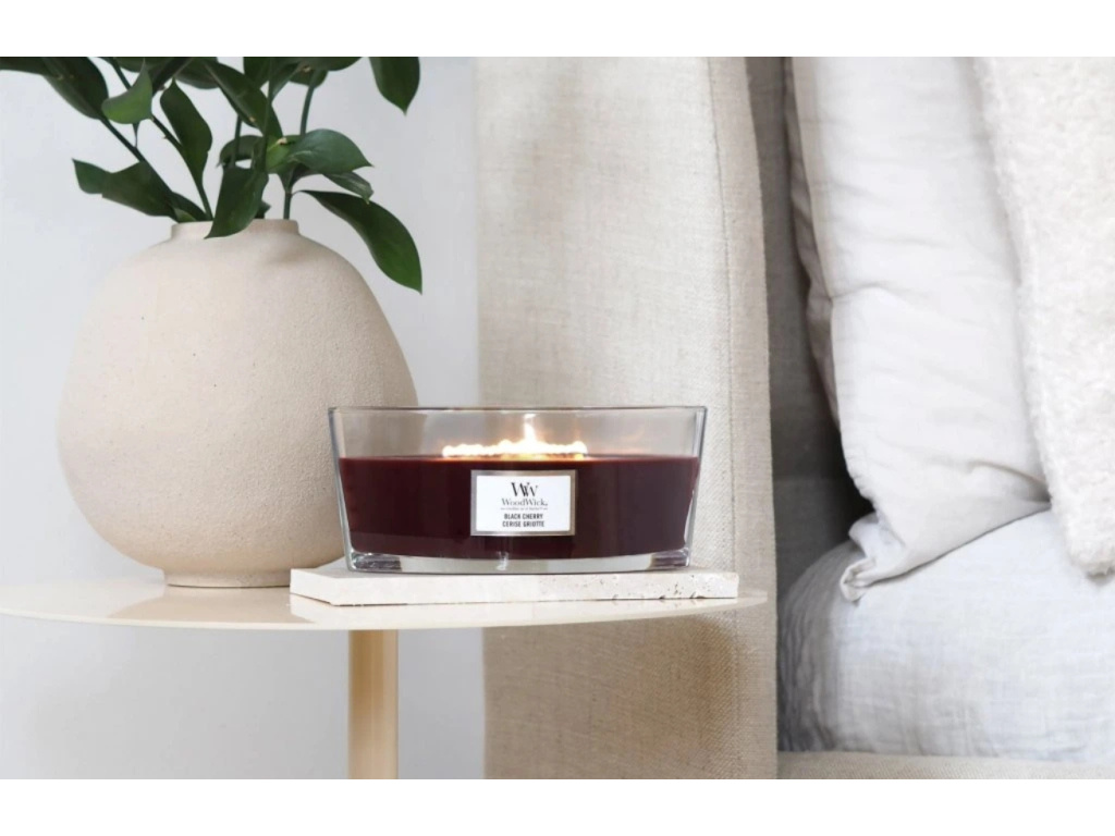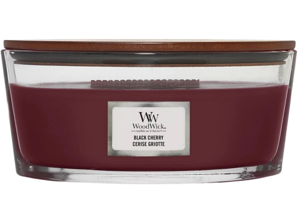 Vonná svíčka ve tvaru lodi WoodWick Black Cherry je vyrobena ze směsi prémiového parafínu a sójového vosku s vysoce koncentrovanými vůněmi, zároveň zajišťuje čisté hoření bez nepříjemných zbytků. Jemný zvuk praskání a dlouhý tančící plamen vytváří neopakovatelnou atmosféru, neboť domov je tam, kde praská oheň. Vůně probouzí vaše nejhezčí vzpomínky a vytváří nové, a to v přívětivém a útulném prostředí. Knot je vyroben z přírodního dřeva. Po vypálení využijte sklenici jako krásnou vázu či pro další dekorační účely. Svíčka Black Cherry přinese do vašeho interiéru bohatou vůni šťavnatých černých třešní.