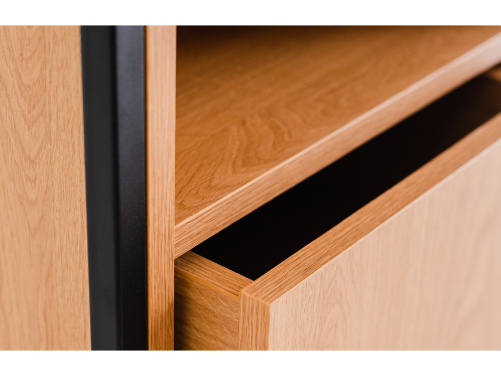 Kolekce modulárních úložných prostor Skipo představuje stylový nábytek, který si jednoduše nakombinujete podle vašich představ. Najdete v ní několik velikostí skříněk, které mohou být využity jako knihovny, komody, noční stolky nebo třeba TV stolky. Zkrátka je použijte tam, kde je potřeba! Spojení dubového dekoru a kovového rámu je nadčasové a skvěle zapadne do minimalistických i industriálních prostor. Tato vyšší verze komody Skipo disponuje dvěma uzavřenými a třemi otevřenými policemi a také praktickou zásuvkou, dostupná je také v černém provedení.