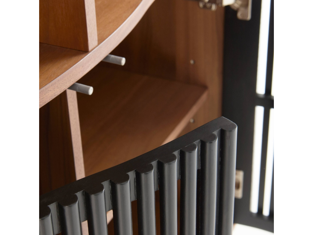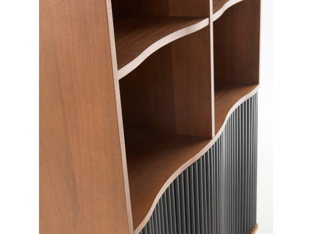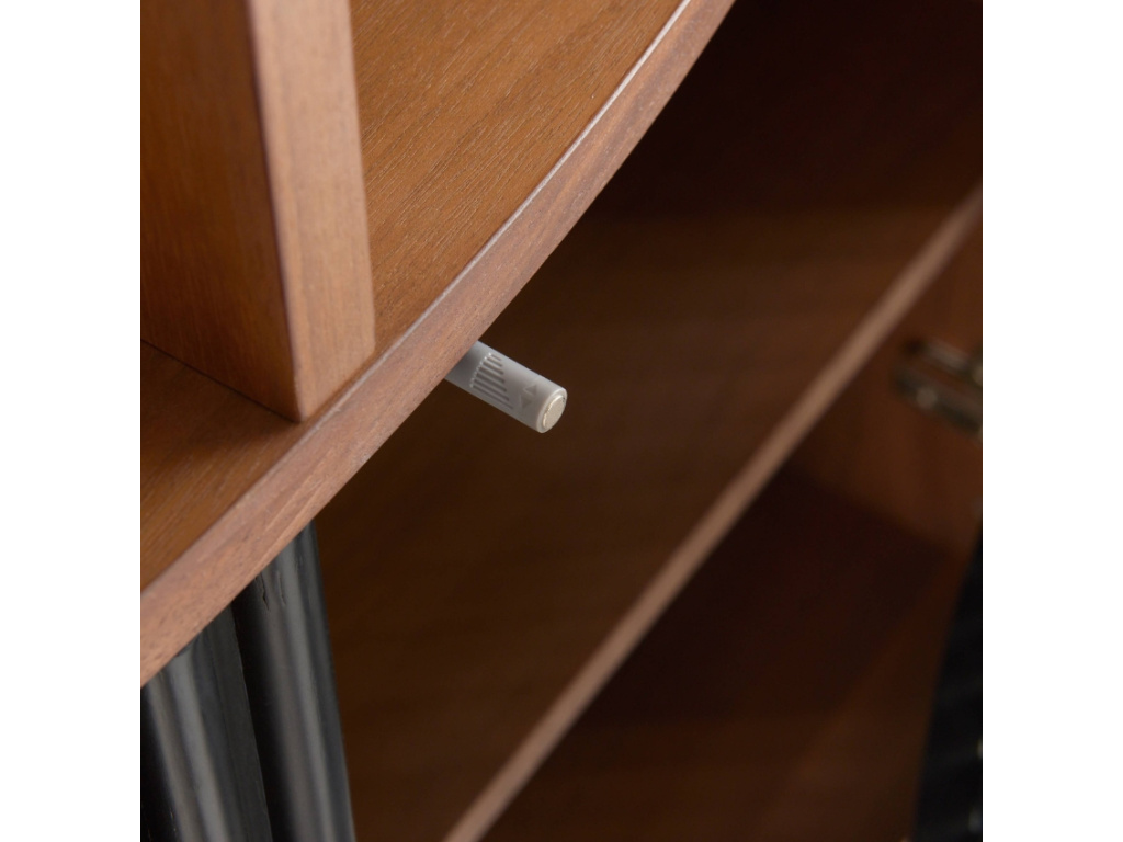 Komoda Lövstrand je elegantním kouskem, který sází na vyváženou kombinaci ořechového dekoru a jemně laděných kovových prvků, které jí propůjčují moderní nadčasový vzhled. Tato komoda nabízí úložný prostor v podobě čtveřice otevřených polic pro vystavení dekorací nebo knih, a také čtveřice uzavřených, s měkce dovírajícími dveřmi pro diskrétní uskladnění věcí, které nemusejí být na očích. MDF s ořechovým dýhováním doplněné o stabilní kovový rám zaručuje, že komoda nejen skvěle vypadá, ale i dlouho poslouží. Vyšší podnož usnadňuje úklid, zatímco nosnost 20 kg znamená, že zvládne i těžší předměty. Díky částečnému předmontování ji zvládnete sestavit během chvíle a doplnit ji navíc můžete designově sladěným pracovním stolem.
