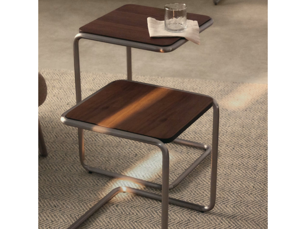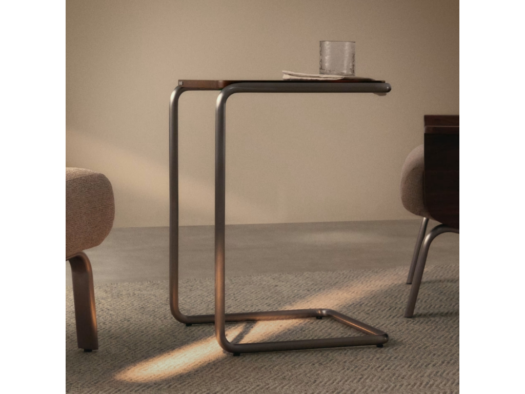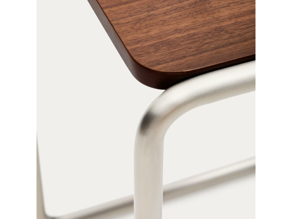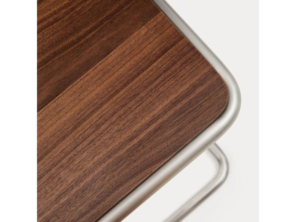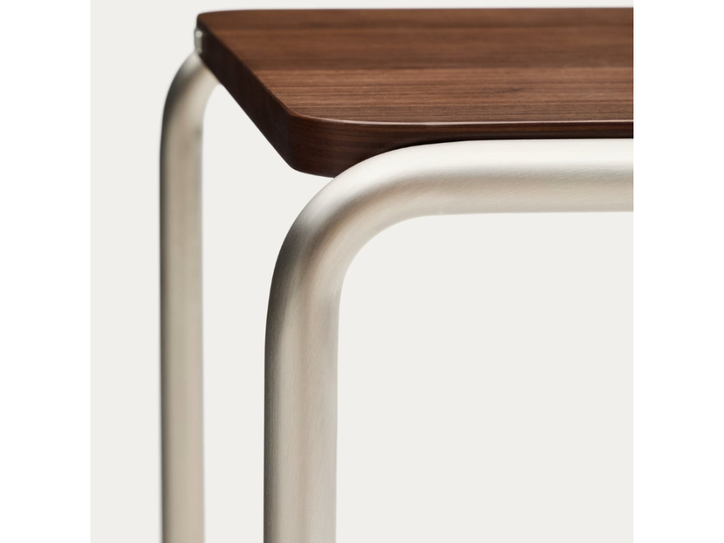 Stolek Tarsel přináší reinterpretaci elegance poloviny 20. století prostřednictvím současného designového jazyka, který dokonale vyvažuje funkčnost a vizuální sofistikovanost. Jeho vrchní deska z ořechové dýhy o tloušťce 0,6 mm s tmavým mořením vytváří harmonický kontrast s trubkovou konstrukcí z nerezové oceli s kartáčovanou úpravou, která účinně redukuje viditelnost otisků prstů. Použité dřevo nese 100% certifikaci FSC™, což zaručuje odpovědné lesní hospodaření, sledovatelnost původu a respekt k životnímu prostředí. Tarsel lze kombinovat se stejnojmennou lavicí a vytvořit tak praktické a designově sladěné duo. Díky nastavitelným prvkům na podnoži se snadno přizpůsobí i nerovným podlahám, čímž zajišťuje stabilitu a komfort v každém prostoru – ideální volba pro stylové a flexibilní bydlení.