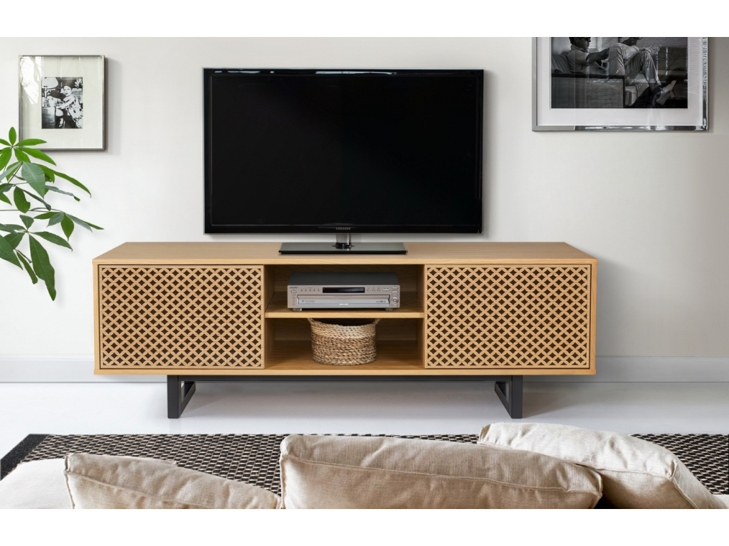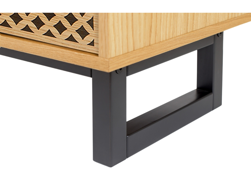 Dřevěný TV stolek Camden od značky Woodman na první pohled zaujme svým atraktivním a nevšedním designem. Korpus stolku z dřevovláknité desky potažené dýhou s dubovým dekorem doplňuje podnož z černě lakovaného březového masivního dřeva a díky tomu vzniká zajímavý materiálový kontrast. Dvířka jsou vyrobená ze stejného materiálu jako korpus a jsou zdobená černým inkoustovým potiskem diamantového vzoru, což přidá na originalitě. Kromě neobvyklého designu nabízí stolek Camden dostatek úložného prostoru a bude jen na vás, jak ho využijete.