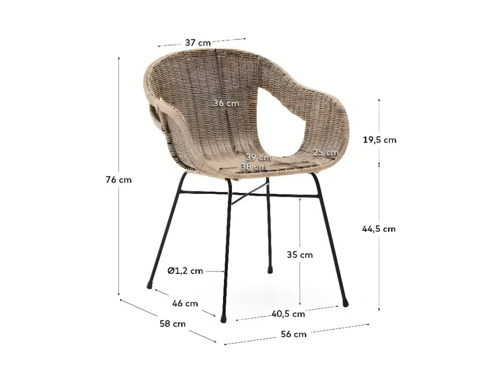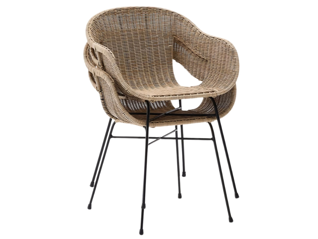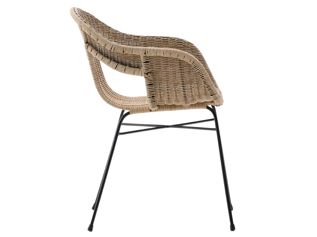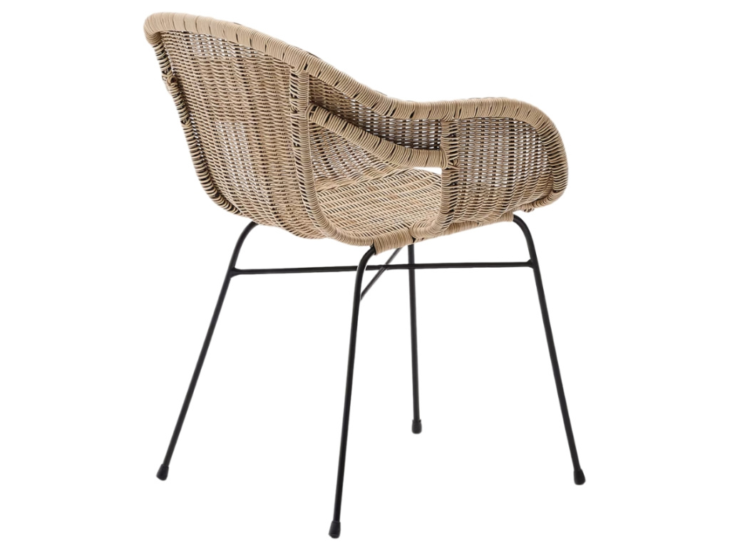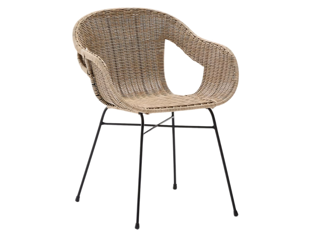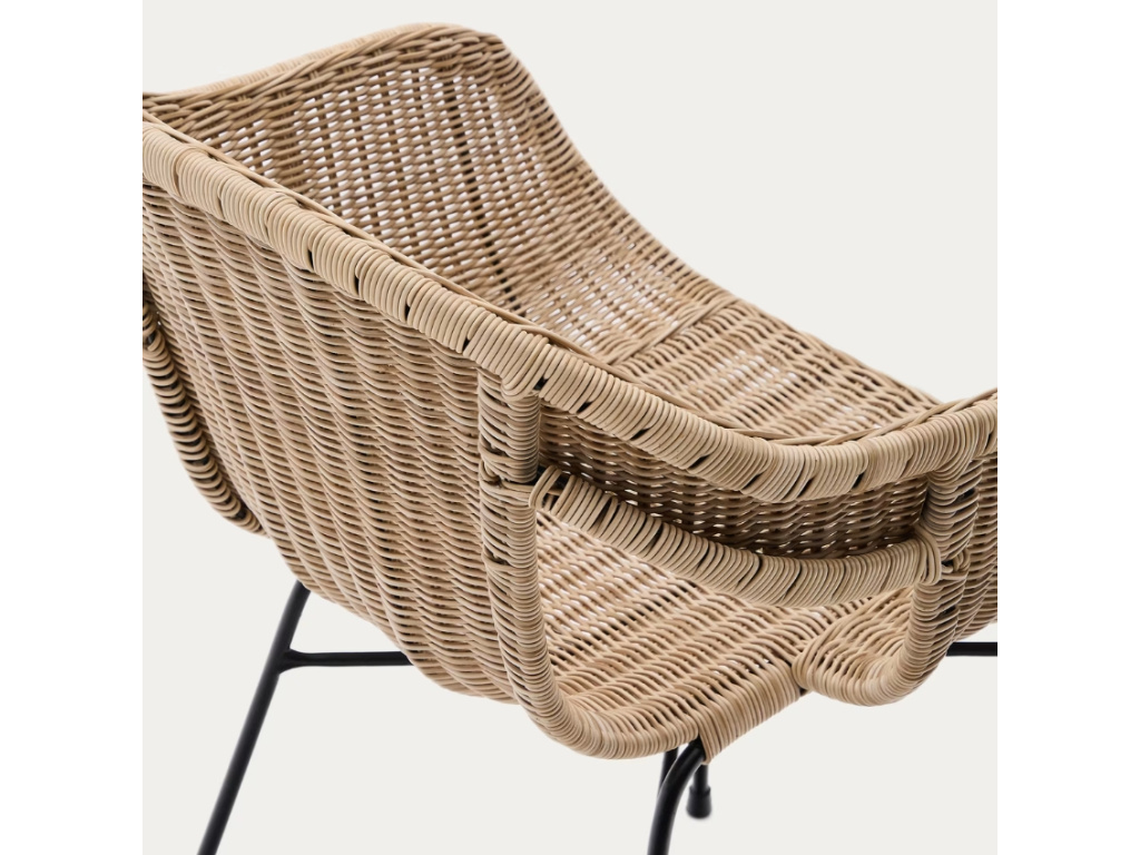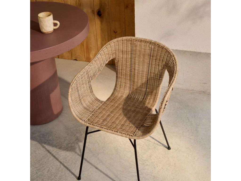 Jídelní židle Kave Home Eltiera skvěle doplní jak venkovní, tak vnitřní prostory. Ručně vyplétaný sedák ze syntetického ratanu, který věrohodně imituje přírodní materiál, dodává celkovému designu lehkost a vzdušnost, zatímco černá ocelová konstrukce zajišťuje stabilitu a dlouhou životnost. Díky UV odolnosti si materiál zachovává svůj vzhled i při vystavení slunečnímu záření a nevyžaduje náročnou údržbu. Měkké oblé linie dodávají židli elegantní vzhled, který snadno sladíte s dřevěným nábytkem i moderním kovovým vybavením.