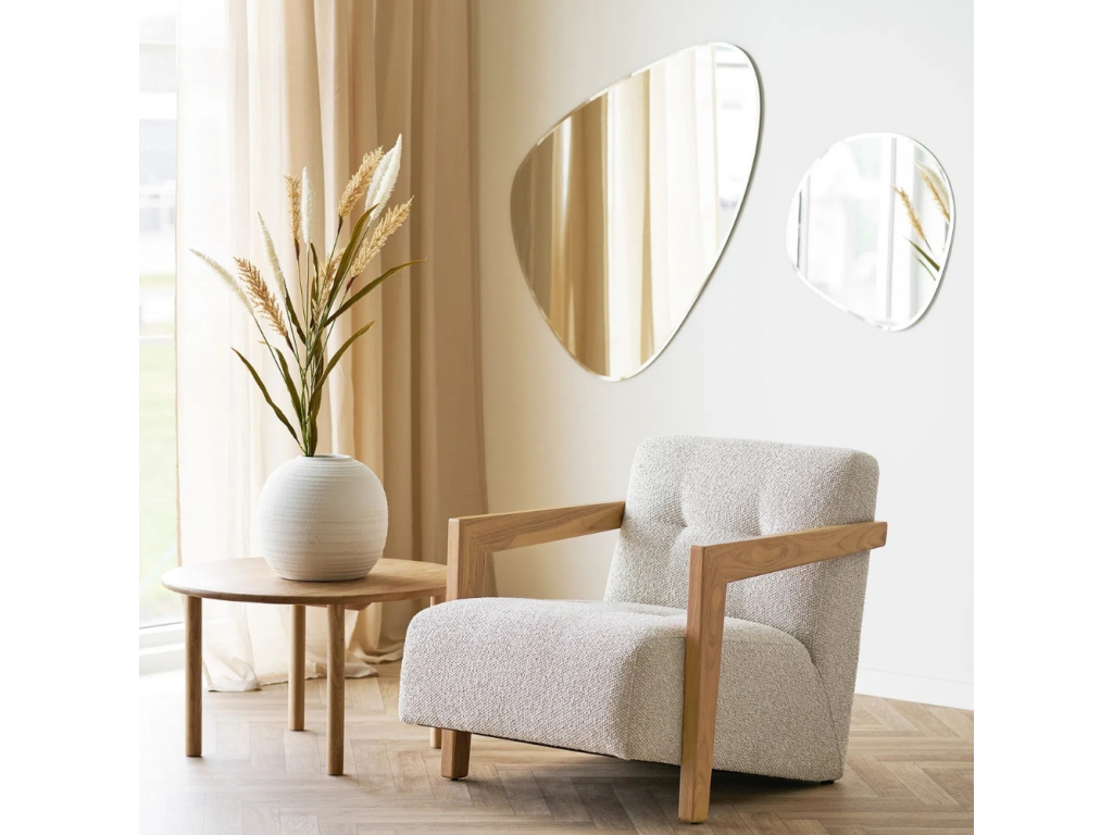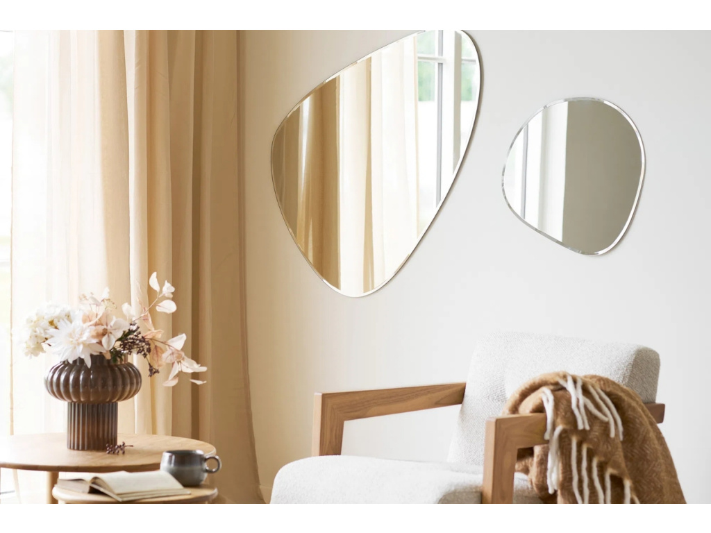 Závěsné zrcadlo Devon přináší do vašeho interiéru svěží moderní energii a jemnou asymetrii, která zaujme na první pohled. Díky svému organickému tvaru rozbíjí rovné linie místnosti a přirozeně ji opticky otevře. Lesklý rám decentně odráží světlo a dodává zrcadlu exkluzivní vzhled. Praktické uchycení umožňuje zavěsit zrcadlo jak vertikálně, tak horizontálně, takže se snadno přizpůsobí různým prostorům. Skvěle vynikne v předsíni, ložnici či nad toaletním stolkem, kde vytvoří stylový kout, do kterého se budete rádi vracet. Zrcadlo nejen podtrhne estetiku interiéru, ale také ho prosvětlí a opticky zvětší. Jeho neutrální elegance se dokonale kombinuje s minimalistickým i boho zařízením. Tento kousek zkrátka přetváří běžný stěnový prvek v atraktivní designový doplněk.