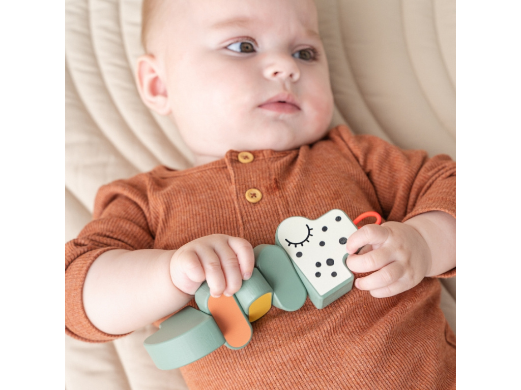 Dřevěná hračka Done by Deer Croco bude zábavným doplňkem pro všechny malé drobečky, kteří objevují svět. Hračka povzbudí smysly a bude vybízet ke zkoumání nejen zvídavé prstíky. Ohebné klouby krokodýla trénují jemnou motoriku a pohyb rukou a zábavné kontrastní barvy zase stimulují dětský zrak. Díky elastickému poutku hračku snadno zavěsíte například na dětskou autosedačku či kočárek. Dopřejte vašemu děťátku hodiny hraní s krokodýlem Croco, se kterým si užijí mnoho zábavy!