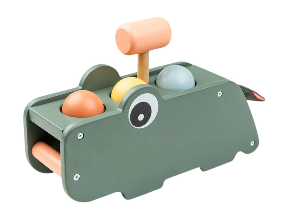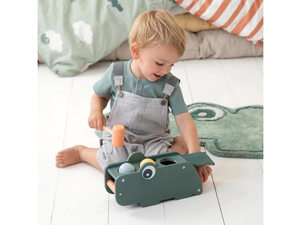 Zatloukací hračka v podobě dřevěného krokodýla Croca od Done by Deer pomůže dětem rozvíjet jejich motorické schopnosti a smysly. Pomocí kladívka se snaží zatloukat barevné kuličky do kulatých otvorů, a tím procvičují koordinaci ruka-oko. Pestré barvy uspokojí zrakové smysly a ouška zase potěší otevírací klapka na zadní straně, která příjemně praská. Oranžová rukojeť usnadní přenášení i těm nejmenším.