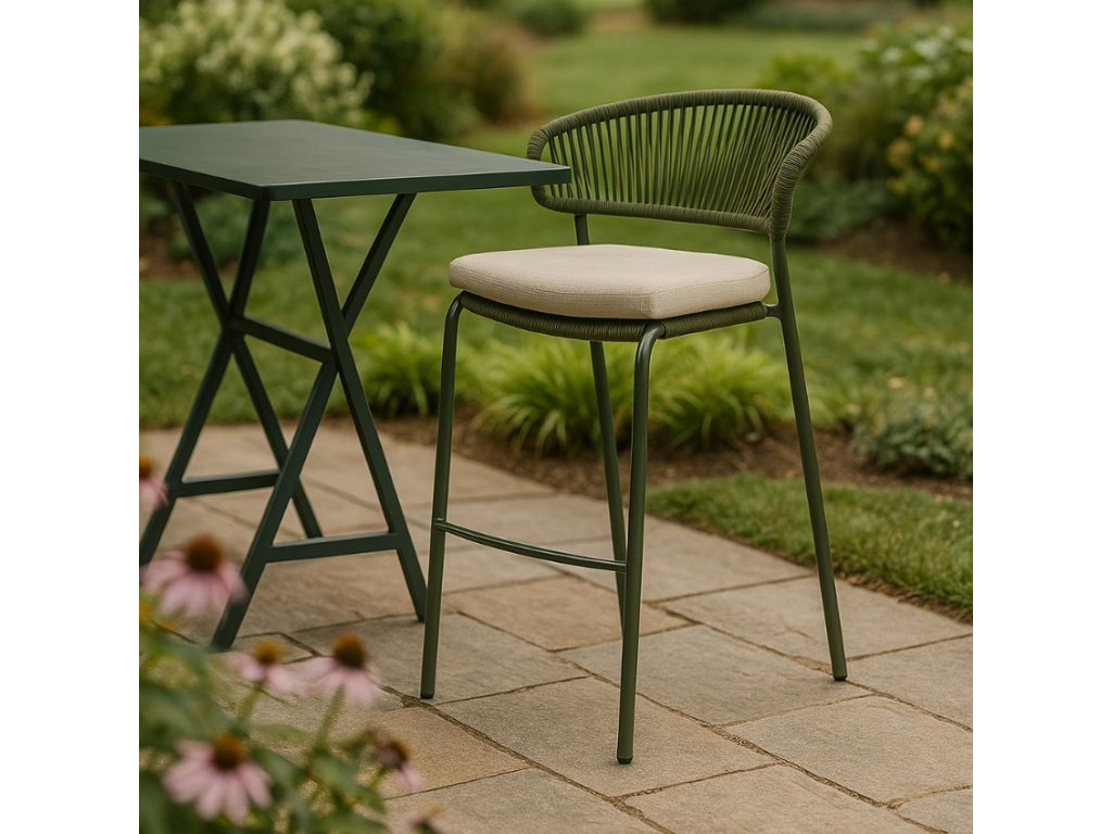Barová židle Randall v zeleném provedení zaujme svým odlehčeným designem a precizním zpracováním. Elegantní vyplétaná opěrka zajišťuje příjemné větrání i při horkých dnech. Stabilní ocelová konstrukce s úpravou pro venkovní použití doplňuje čalouněný sedák ze světle šedé látky, ideální pro dlouhé posezení během letních večerů. Kolekce Randall přináší moderní a zároveň útulný výraz na městské terasy i do klidných zahradních zákoutí.