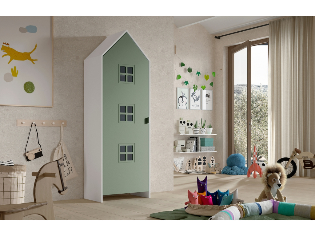 Minimalistická šatní skříň Vipack Casami na první pohled zaujme jednoduchým designem ve tvaru domečku se třemi okénky. Je vyrobena z lakovaného MDF, které dodává skříni patřičnou stabilitu a odolnost. Obsahuje celkem čtyři police, kam můžete uložit dětské oblečení, hračky a doplňky a v případě potřeby prostřední polici vyjmout a oblečení pověsit. Přírodní zelená barva dodá skříni hravý vzhled a zútulní každý dětský pokoj. Interiér můžete vyladit k dokonalosti i s dalším nábytkem z kolekce Casami.