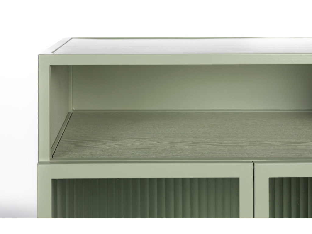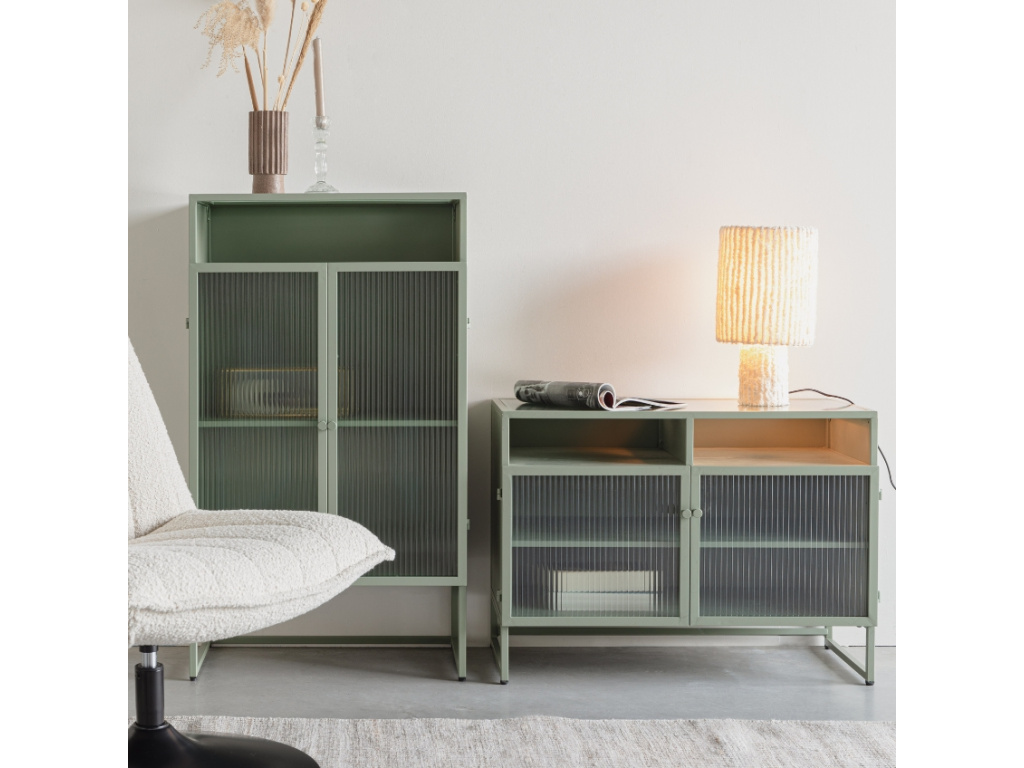 S minimalistickou vitrínou HERBE od značky White Label Living získáte mnoho úložného prostoru navíc a zároveň obohatíte váš interiér o designový kus nábytku. V HERBE najdete dostatek místa pro uložení a vystavení vašich oblíbených dekorací v podobě uzavřené a otevřené police. Vitrína je vyrobena z lakovaného MDF v krásném zeleném odstínu, který prozáří a zvýrazní vzhled vašeho interiéru. Jednoduchá kovová podnož příjemně kontrastuje se skleněnými dvířky a dodává vitríně dojem vzdušnosti. HERBE bude stylovým kouskem, který se bude nejlépe vyjímat v moderním interiéru. Sladit ji můžete s dalšími produkty ze stejnojmenné kolekce.