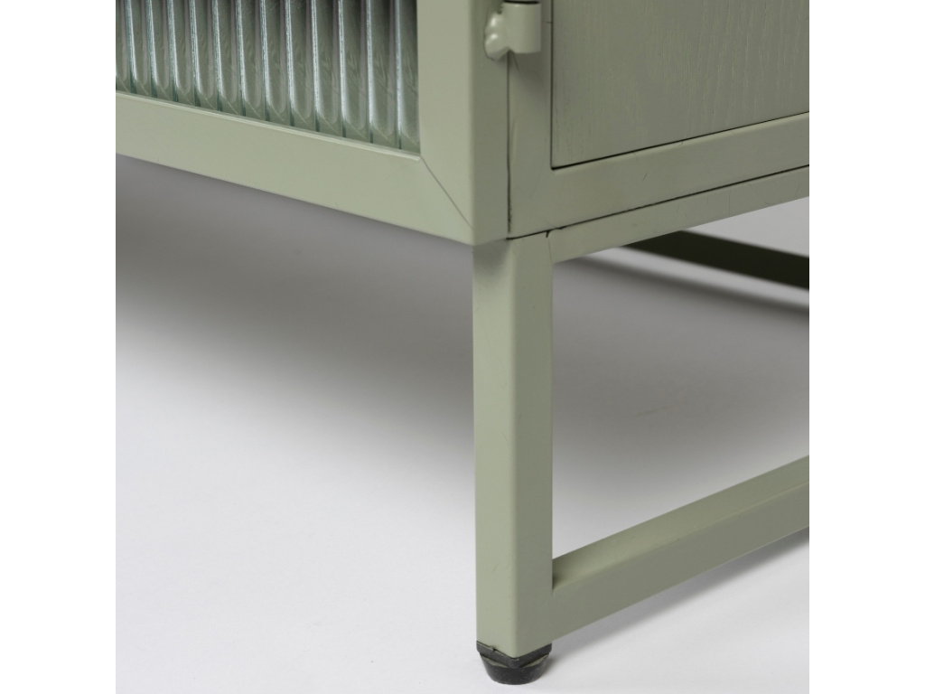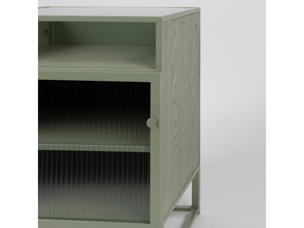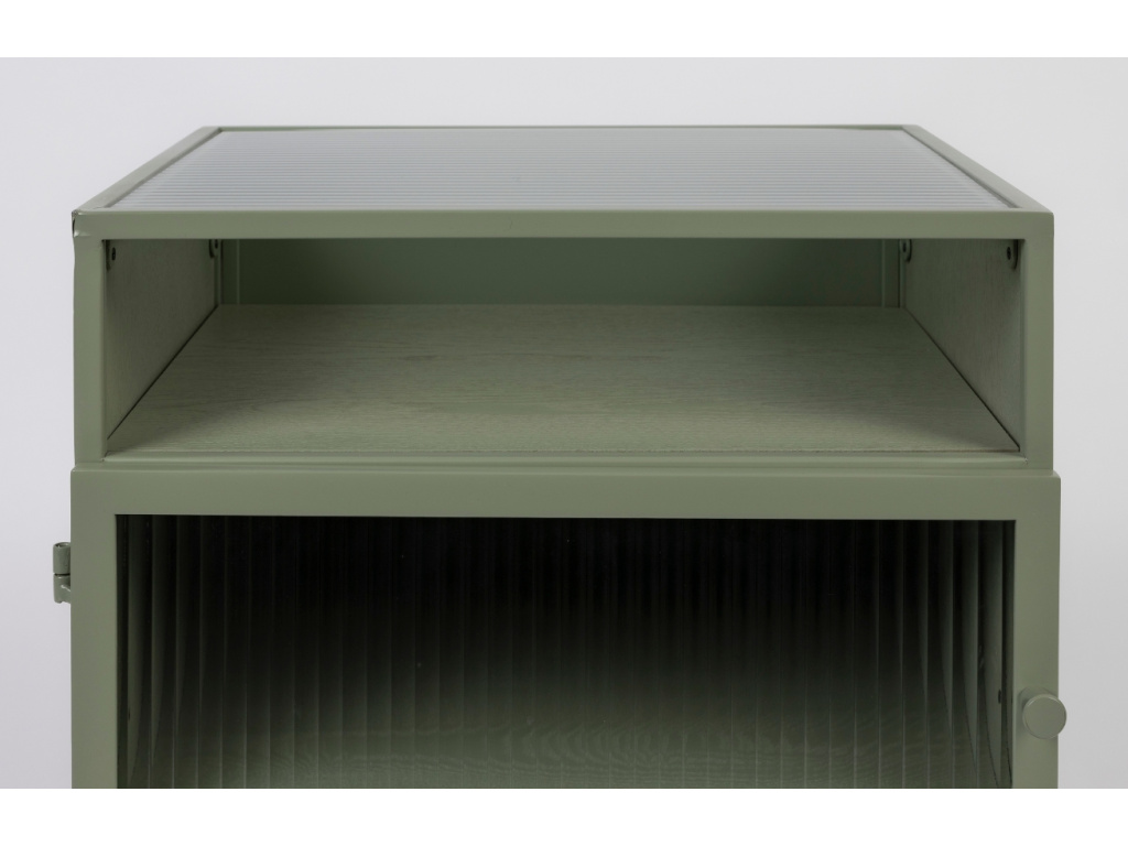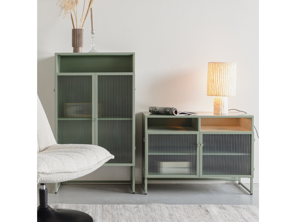 S minimalistickou vitrínou HERBE od značky White Label Living úložný prostor navíc a zároveň obohatíte váš interiér o designový kousek. V HERBE najdete dostatek místa pro vystavení vašich oblíbených dekorací v podobě dvou polic. Vitrína je vyrobena z lakovaného MDF v krásném zeleném odstínu, který prozáří a zvýrazní vzhled vašeho interiéru. Jednoduchá kovová podnož příjemně kontrastuje se skleněnými dvířky a dodává vitríně dojem vzdušnosti. HERBE bude stylovým kouskem, který se bude nejlépe vyjímat v moderním interiéru. Sladit ji můžete s dalšími produkty ze stejnojmenné kolekce.