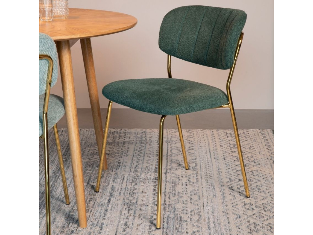 Jídelní židle Jolien upoutá svým minimalistickým stylem. Sedák a záda čalouněné látky v zelené barvě společně s kovovou lakovanou podnoží ve zlaté barvě dodá vašemu tělu ideální komfort a pohodlí nejen v kancelářích.