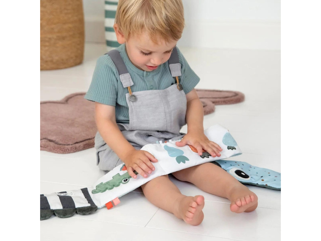 Krokodýl Croco vás zavede do pohádkové říše a seznámí s několika přáteli z kolekce Deer friends. Měkoučká dětská knížka je plná stimulujících funkcí, rozličných textur, tvarů a kontrastních pestrých barev, které jsou ideální pro malé zvídavé prsty a mysl. Na jedné straně knihy nosorožec Nozo a krokodýl Croco ochutnávají šťavnaté ovoce, a na té druhé Croco a hrošík Ozzo létají v oblacích mezi mráčky. V knize najdete i šustící a praskavé zvuky, které uspokojí dětská ouška. Objevte také zbytek přátel z kolekce Deer friends, které u nás najdete pod značkou Done by Deer.