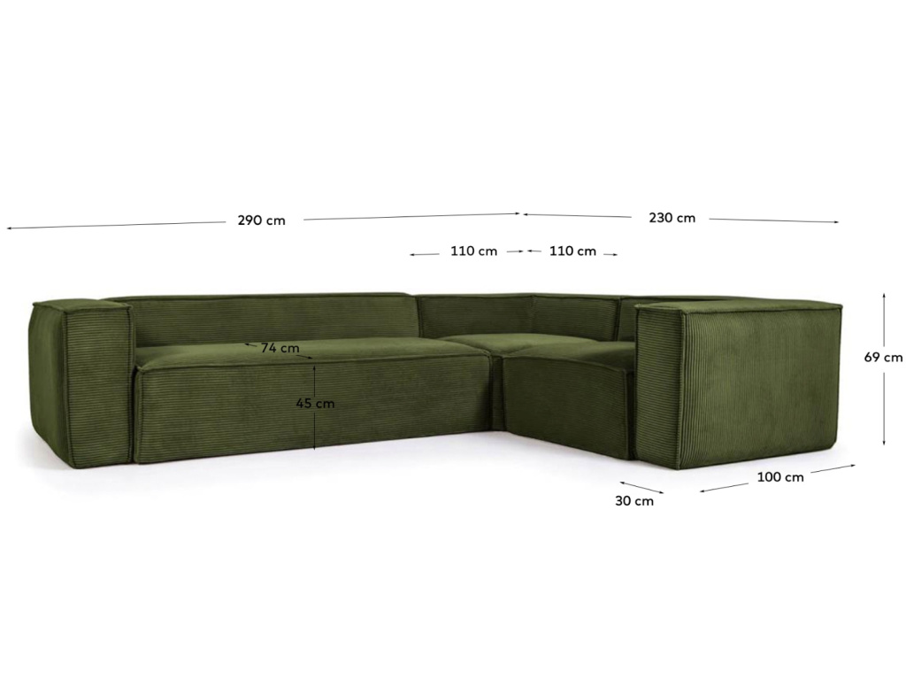 Elegantní zelená rohová pohovka Kave Home Blok hravě splňuje všechny požadavky na ideálního společníka pro chvíle odpočinku a relaxace. Maximální komfort zaručuje měkký sedák a také originální, na dotek velmi příjemné, manšestrové čalounění v zeleném odstínu. Prostorná pohovka skvěle vynikne jak ve skandinávských, tak i v moderních interiérech s vintage prvky. Užijte si s celou rodinou či návštěvou pohodlí a vychutnejte si originální styl s pohovkou Blok.
